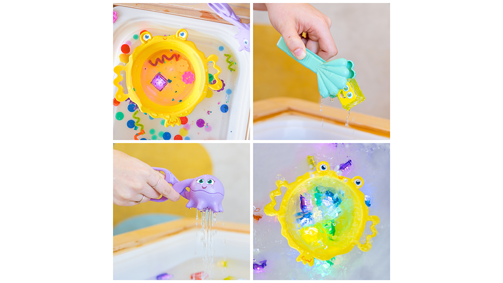 Djeca mogu grabiti, cijediti i prosijavati s ovim životinjicama izrađenim od medicinskog silikona. Mališani mogu razvijati svoju "koordinaciju ruka-oko" dok uživaju u senzornoj igri s "Puffer Pal Proširivim Cjedilom", "Clamp Školjka Mini Hvataljkom" i "3-u-1 Scooper Sipa".