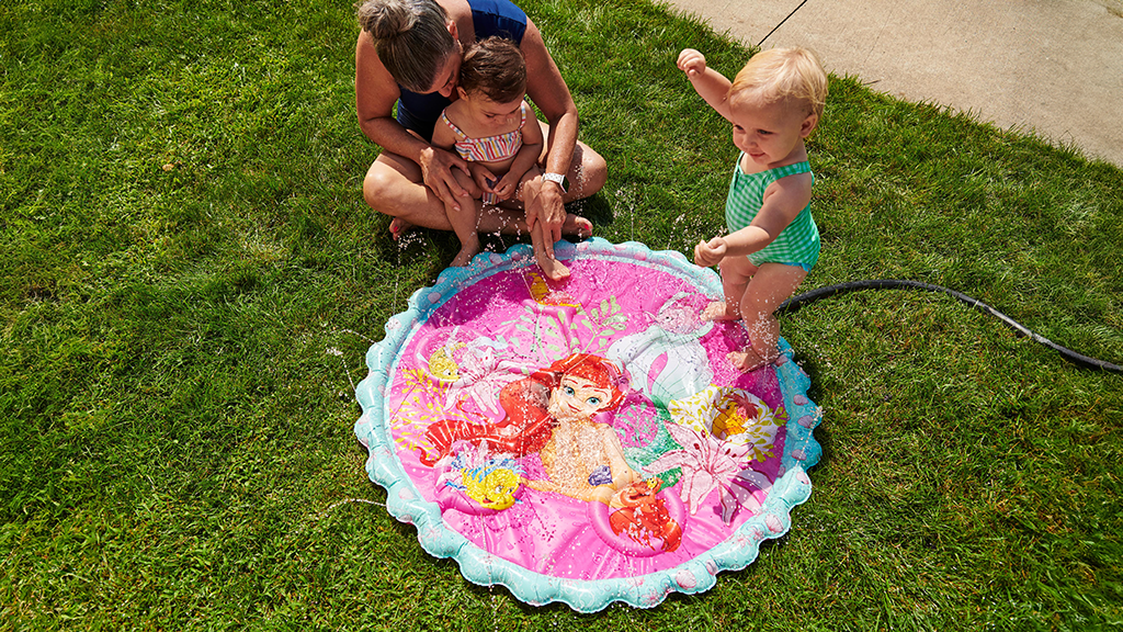 Djeca se mogu igrati sa svojim omiljenim likovima, kao što su PAW Patrol, Disney i drugi, na SwimWays Splash Mat-u. Mališani se mogu rashladiti tijekom vrućih dana: jednostavno priključite prostirku za prskanje na crijevo i otvorite vodu kako bi prskalice počele raditi.