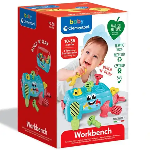 Baby Clementoni radni stol dizajniran je tako da djeca mogu pronaći rupu na klupi i umetnuti obojene vijke i čavle pomoću odgovarajućeg alata. Jarke boje seta zajamčeno će privući pažnju beba. Poboljšava njihovu koncentraciju i razvija koordinaciju oko-ruka tijekom igranja. Zahvaljujući praktičnom dizajnu, radni stol služi i kao košara. Kada je igra gotova, dijete ga može okrenuti i staviti svoje male igračke u košaru. Iznenadite svoje dijete ovom kreativnom igračkom koja će slaganje i mlataranje učiniti zabavnim. Savršena ideja za poklon za baby shower, također i za trudnice. Igračka je izrađena od visokokvalitetne, 100% reciklirane plastike i dio je Play for Future kolekcije, čime tvrtka Clementoni doprinosi ne samo užitku igranja, već i zaštiti okoliša.