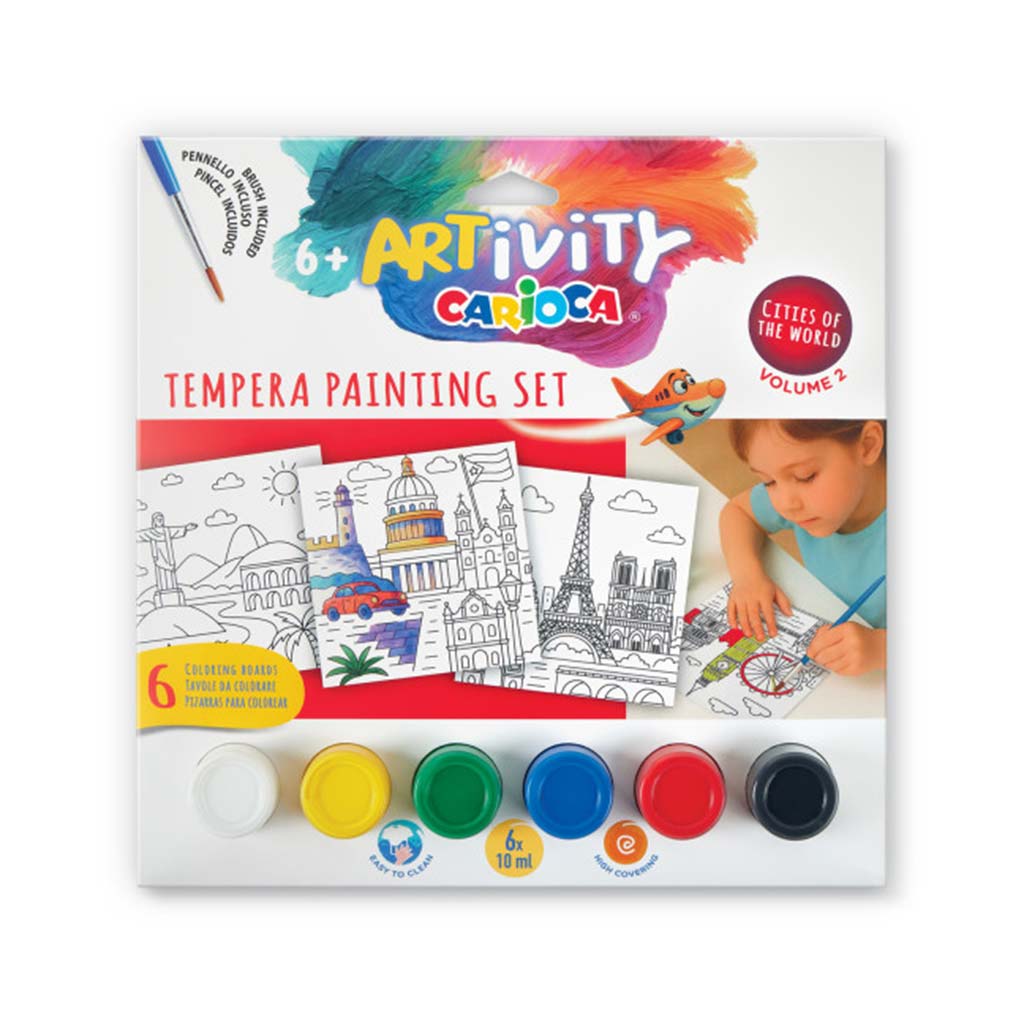 ARTivity Carioca set tempera boja – s temom Europe – izvrstan je izbor ako želite razvijati kreativnost vašeg djeteta, dok se na zabavan način upoznaje sa svjetski poznatim mjestima. Drugi dio serije „Cities of the World” predstavlja europske znamenitosti, pa mališani pri slikanju mogu otkriti, između ostalog, Eiffelov toranj i druge ikonične građevine. Unaprijed nacrtane slike pridonose osjećaju uspjeha, pa vaše dijete lako može stvoriti lijepe, šarene slike.