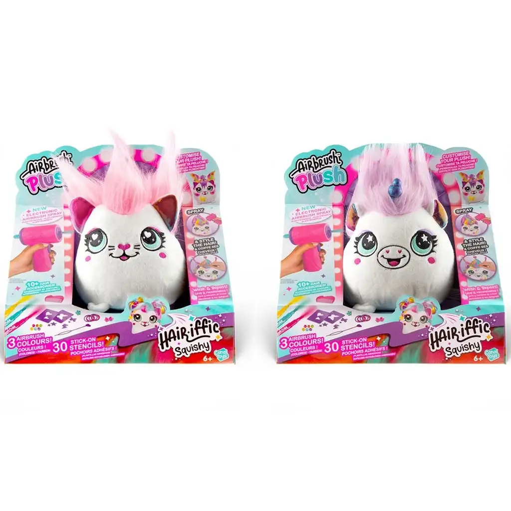 Oslobodite svoju kreativnost s supermekanim Airbrush Plush Hairiffic Squishy plišancima! Ova slatka mala stvorenja – mačka i jednorog – jedva čekaju da dobiju boju i jedinstveni stil od vas. Igra je osmišljena tako da djeca mogu sama ukrašavati, bojati i iznova transformirati svoje plišane prijatelje uz pomoć električnog airbrush pištolja.