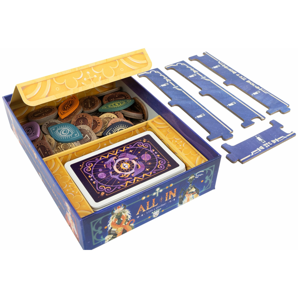 All In – Pogledaj u budućnost! je uzbudljiva i posebna kartaška igra u kojoj zajedno s djetetom možete pokušati pročitati poteze protivnika i razmišljati unaprijed. Impresivne, mistične ilustracije odmah vas uvlače, dok igra stalno postavlja pred vas odluke. Cilj je vješto upravljati svojim kartama i žetonima te u pravom trenutku reći "all in".