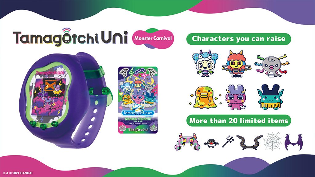 Uđi u svijet Tamaverse s drugom serijom Tamagotchi Uni uređaja. Ova kolekcija sadrži nove kućišta i remene, ograničene likove i mini-igre. Angel Festival donosi slatku atmosferu s ružičastim remenom i pastelnim bojama. Monster Carnival zna kako rockati sa svojim hrabrim i punk dizajnom, koji uključuje tamne ljubičaste i neon zelene boje.