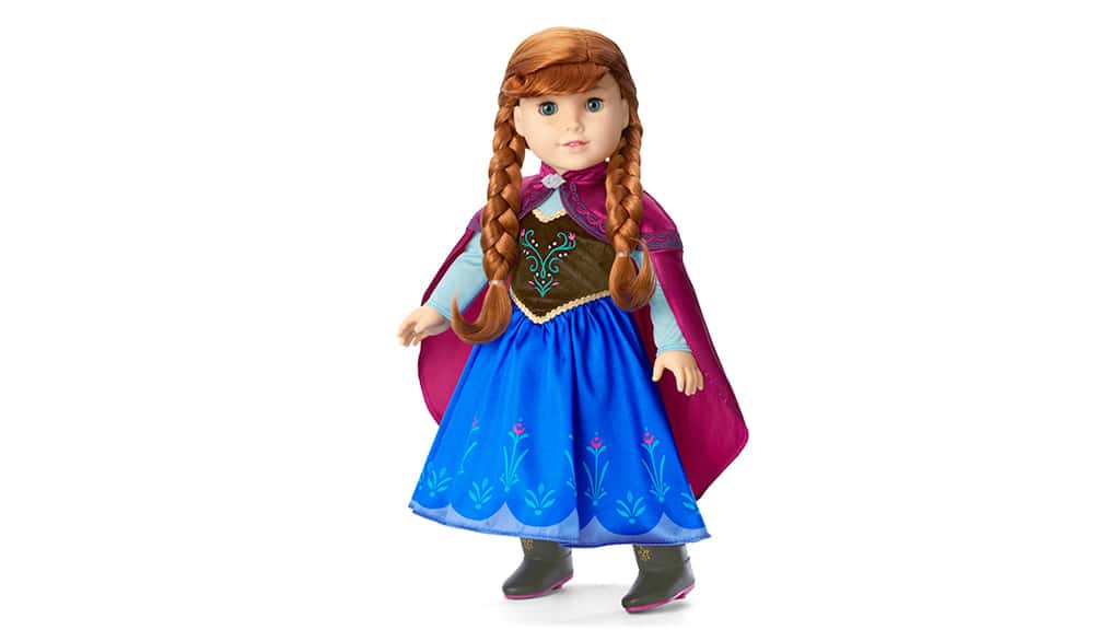 Lutka Elsa utjelovljuje profinjenost i kraljevsku eleganciju u svojoj svijetloplavoj haljini, koju krase satenski gornji dio, sjajni šljokice i svjetlucavi uzorak snježne pahulje. Duga, sa strane ispletena kosa i blistave plave oči upotpunjuju njezin ikoničan izgled. Lutka American Girl dolazi i s cipelama na visoku petu, tri ukosnice i brojnim drugim dodacima, kako bi igra bila još zabavnija i čarobnija za svako dijete.Annine crvenkastosmeđe pletenice i pjegice savršeno pristaju uz njezinu crnu baršunastu i kraljevsko plavu haljinu, koju nadopunjuje dugi, magenta ogrtač, crne čizme i dodatni modni dodaci. Obje lutke imaju mekano, pamučno tijelo, glava i udovi su im pomični, a oči se mogu otvarati i zatvarati, tako da avanture kroz šume i planine postaju zaista realistične! Ove detaljno izrađene lutke ne samo da čine igru uzbudljivom, već potiču i dječju maštu dok s njima smišljaju i proživljavaju nove priče.