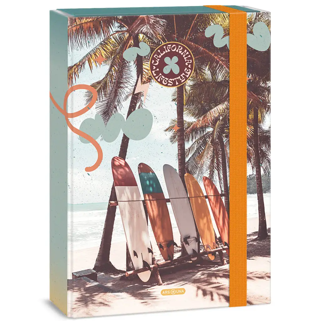 Uživajte u ljetu i kalifornijskom načinu života s ovim posebnim A/4 kutijom za bilježnice! Dio je Ars Una "California Lifestyle" kolekcije i savršen je izbor za one učenike koji ne žele samo organizirati svoje bilježnice i papire, već žele unijeti i malo ljetnog raspoloženja u svoju svakodnevicu. Na naslovnici kutije prikazane su šarene daske za surfanje pod palmama, koje će vas sigurno inspirirati za učenje – ili barem za sanjarenje o moru!
