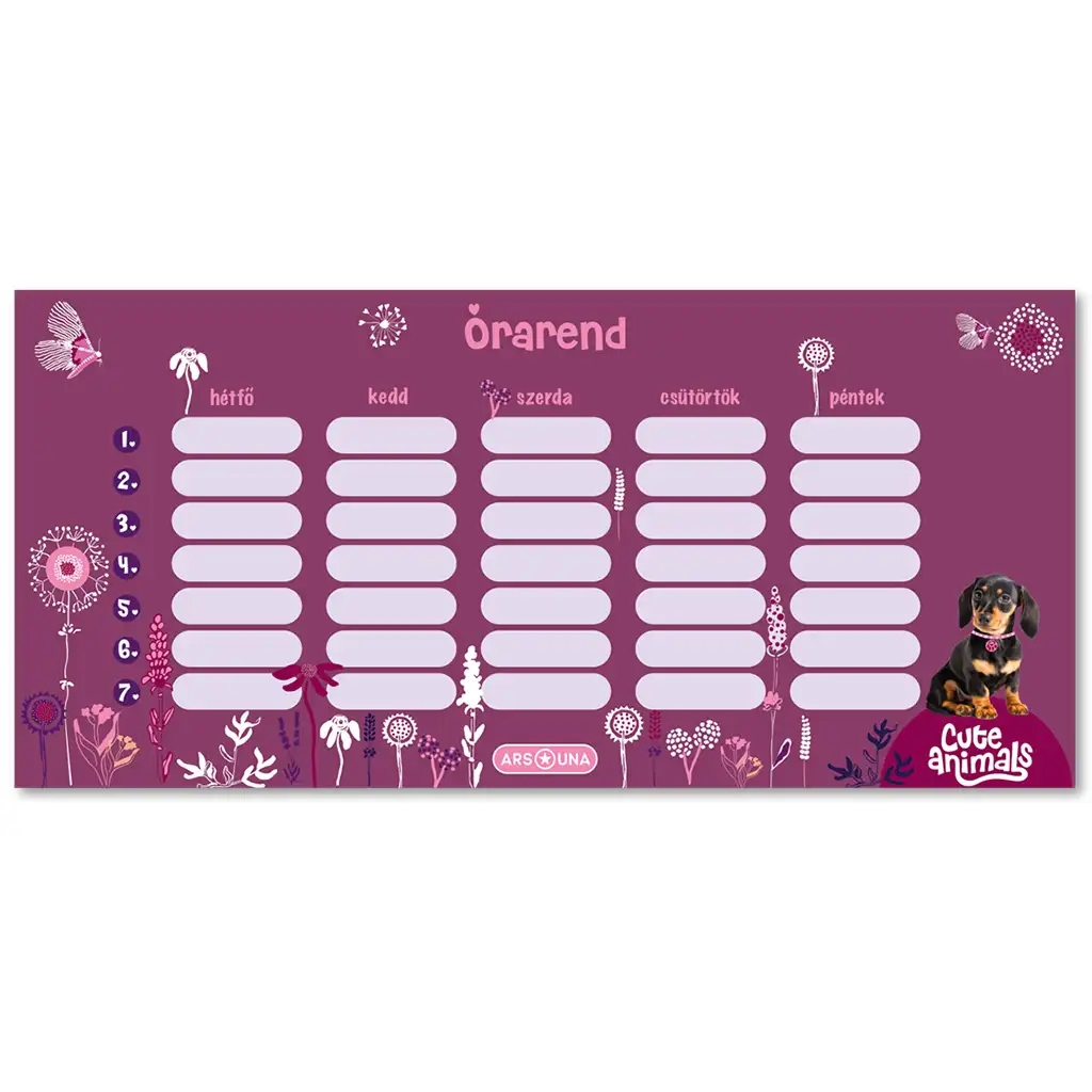 Upoznaj raspored sati Ars Una Cute Animals - Puppy s motivom jazavčara, koji će biti zaista drag i stilski dodatak za svaku djevojku koja voli pse. Ovaj raspored sati s ljubičastom podlogom i uzorkom jazavčara i cvijeća nije samo praktičan, već i sladak i veseo, stvarajući atmosferu koju ćeš željeti imati oko sebe svaki dan.