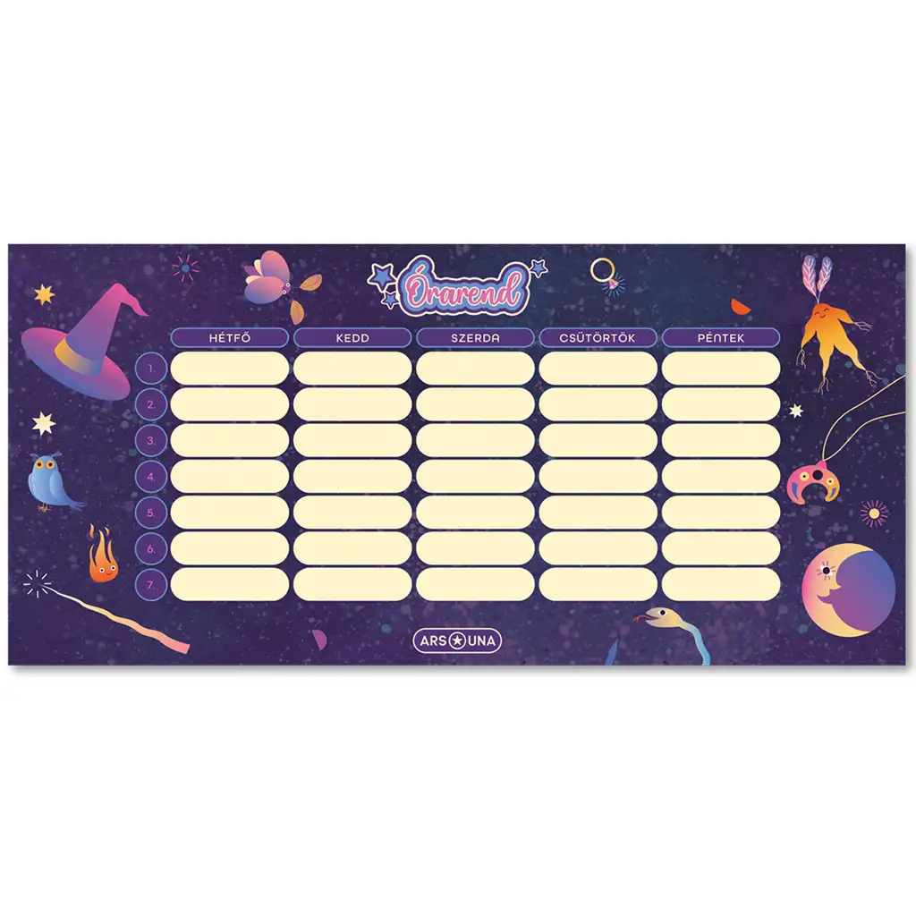 Dimenzije rasporeda (232 x 109 mm) su praktične i lako rukovodive, idealne za školsku torbu ili stol. Bilo da se radi o učenju ili organizaciji, raspored sati Ars Una Enchanted s motivom vještica pomaže ti da uvijek imaš pregledan i organiziran dnevni raspored. Odaberi ovaj jedinstveni i čarobni raspored sati kako bi stilski upravljala svojim svakodnevnim zadacima i dopusti da te motivi vještica inspiriraju i očaraju!