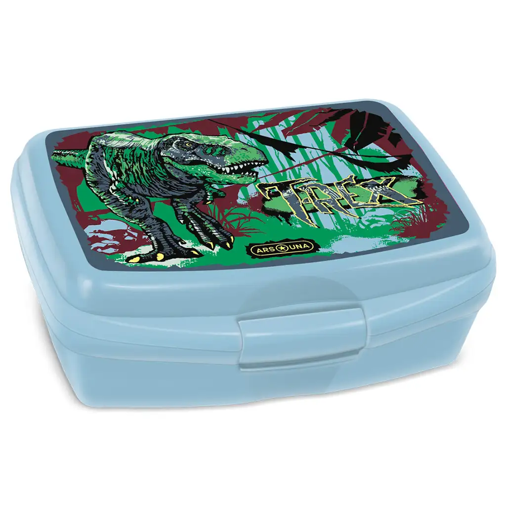 Ars Una T-Rex kutija za užinu s uzorkom T-rexa na plavo-sivoj podlozi idealan je izbor za školu, vrtić i izlete. Ova zatvoriva plastična kutija za užinu praktična je i atraktivna, posebno za ljubitelje dinosaura.