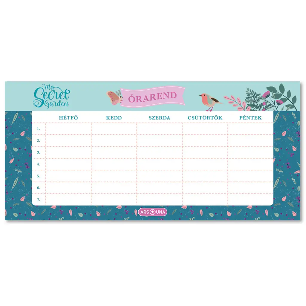 Dimenzije rasporeda (232 x 109 mm) su praktične i jednostavne za rukovanje, idealne za školsku torbu ili stol. Bilo da se radi o učenju ili organizaciji, raspored sati Ars Una My Secret Garden pomaže ti da uvijek imaš pregledan i organiziran dnevni raspored. Odaberi ovaj prekrasan i prirodan raspored sati kako bi stilski upravljala svojim svakodnevnim zadacima i dopusti da cvjetni i lisnati uzorci prizovu harmoniju i ljepotu prirode!