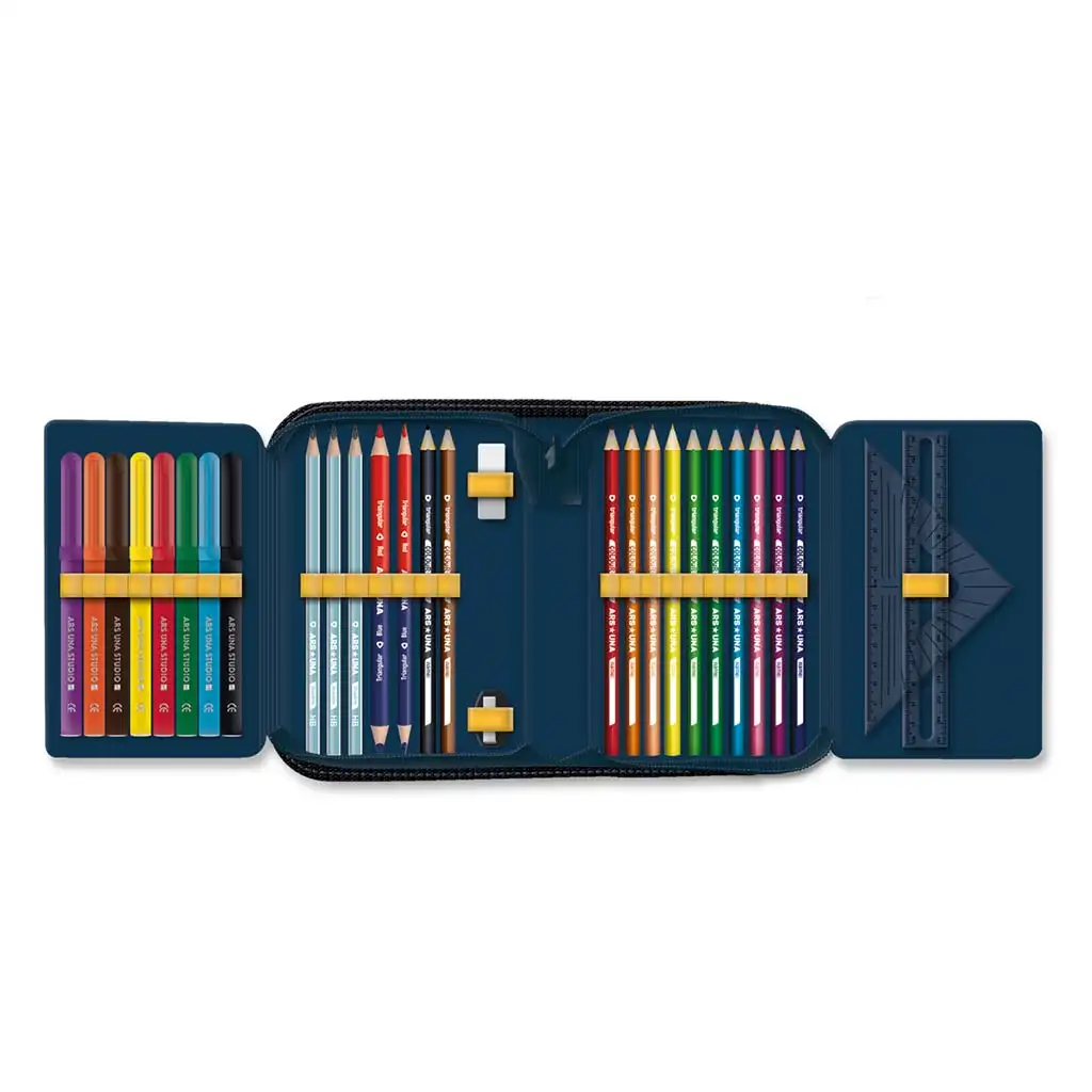 Pernica ima tri pregrade s preglednom i organiziranom unutrašnjošću. Set sadrži 12 bojica i 8 flomastera, s kojima će satovi likovnog i kreativni zadaci biti pravo veselje. Osim toga, tu su i 3 HB grafitne olovke, gumica, šiljilo, te ravnalo i trokutić. Praktičan mali raspored sati za tjedan A i B pomaže da mali ninja uvijek bude spreman za školske obveze.