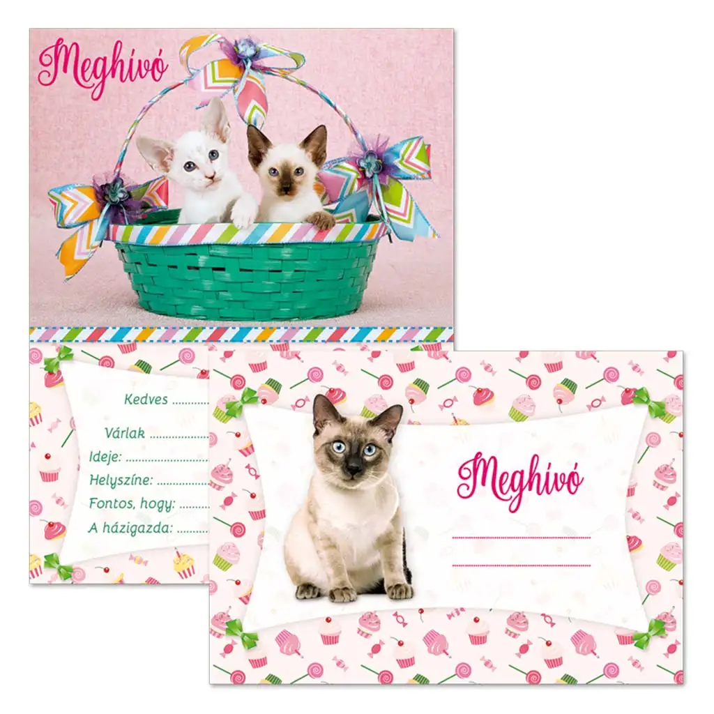 Ovaj set od 10 pozivnica za zabavu savršen je izbor za sve male ljubitelje mačaka koji žele na razigran i simpatičan način pozvati svoje prijatelje na rođendansku proslavu ili neki drugi događaj. Na prednjoj strani pozivnice nasmiješene mace proviruju iz šarmantne zelene košarice, ukrašene šarenim mašnicama i veselim pozadinama sa slatkišima – zajamčeno će izmamiti osmijeh na lice svakom uzvaniku!
