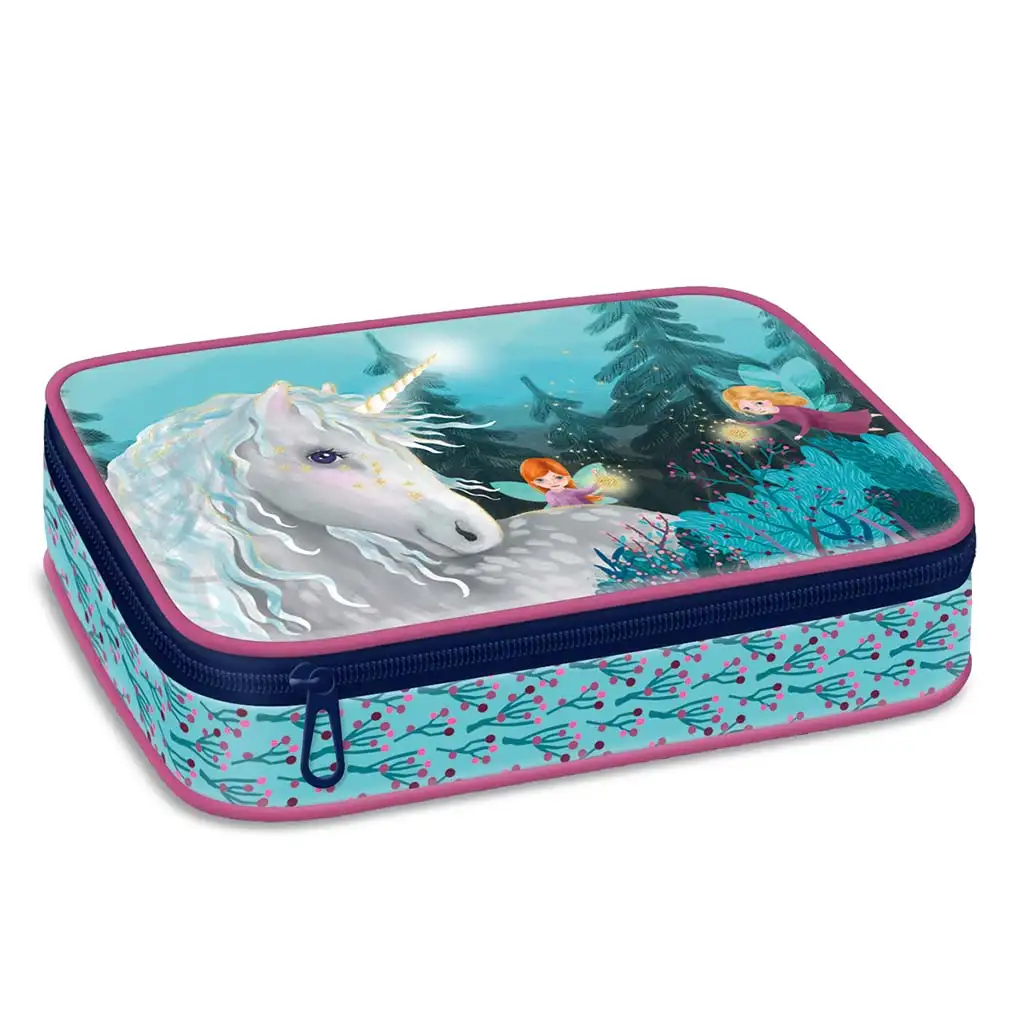 Stardust višeslojna pernica donosi pravu čarobnu bajku u školu! Bijeli jednorog sa sjajnim rogom i vilinskom scenom iz bajke potiče maštu svakog učenika, dok praktičan dizajn pernice pomaže u svakodnevnoj organizaciji. Svjetloplava i ružičasta osnovna boja ukrašena je veselom, šumskom uzorkom, što ovaj školski dodatak čini još posebnijim.