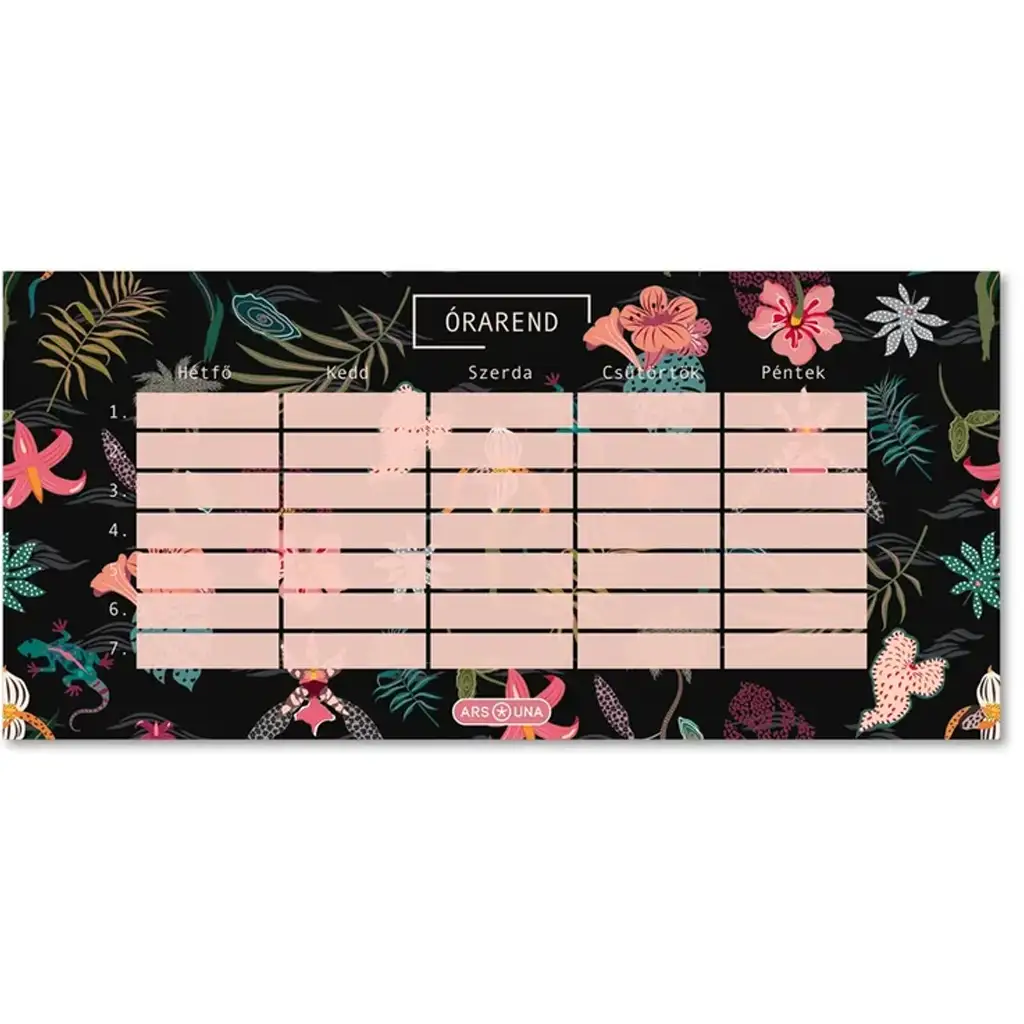 Ponesi atmosferu tropskih krajeva sa sobom u školu uz ovaj prekrasni Tahiti raspored sati! Ars Una Tahiti jednodijelni, dvoslojni raspored sati s egzotičnim cvijećem, bujnom vegetacijom i šarenim motivima uljepšat će ti svakodnevno učenje. Posebne boje i detaljna grafika sigurno će osvježiti tvoj radni stol ili korice bilježnice, a pritom je i vrlo praktičan – pomaže ti organizirati tjedni raspored sati.