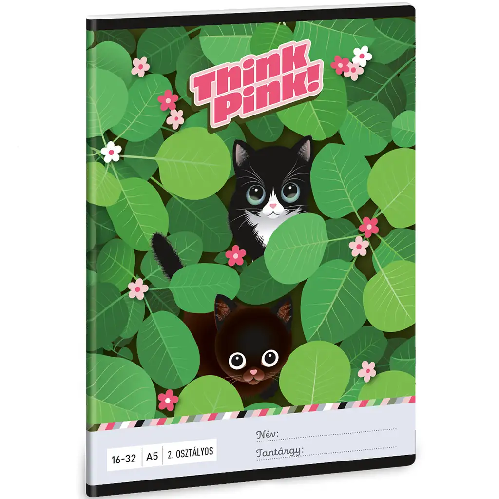 Think Pink bilježnica formata A/5 s crticama za 2. razred savršen je izbor za sve male ljubitelje životinja i prirode koji vole vesele, razigrane uzorke. Na naslovnici dvije slatke mačkice proviruju iz gusto zelenog lišća ukrašenog malim ružičastim cvjetovima. Šarmantan dizajn odiše prijateljskom atmosferom i zajamčeno će izmamiti osmijeh na lice vašeg djeteta svaki put kada izvuče bilježnicu u školi ili kod kuće.