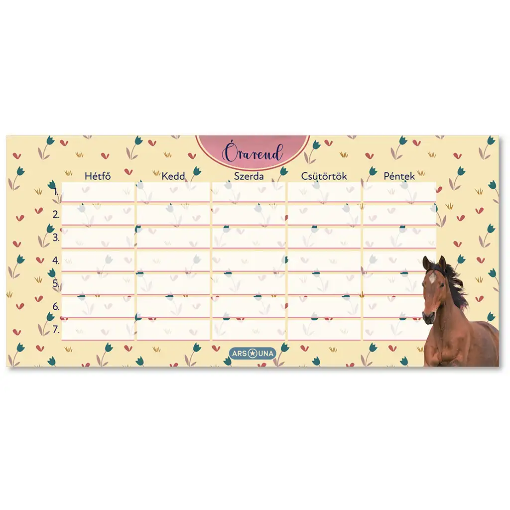 Upoznaj raspored sati Ars Una Wild and Free s konjima, koji je prekrasan i stilski dodatak za svaku djevojku koja voli konje i prirodu. Ovaj raspored sati ukrašen je cvjetnim i konjskim uzorcima na svijetložutoj pozadini, što ga čini ne samo praktičnim, već i inspirativnim te prirodnim, kao da šetaš livadom punom slobodno pasućih konja i cvijeća.