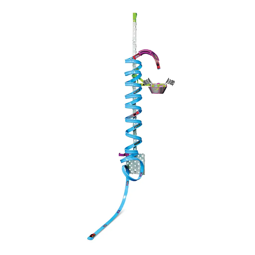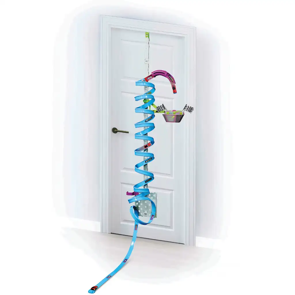 Staza se lako pričvršćuje na vrh vrata, a zatim se spušta sve do poda. Zahvaljujući posebnom gravitacijskom sustavu, nema potrebe za motornim pogonom ili baterijama, tako da djeca mogu iznova i iznova pokretati vozilo kako bi postigla impresivnu brzinu i zamah.