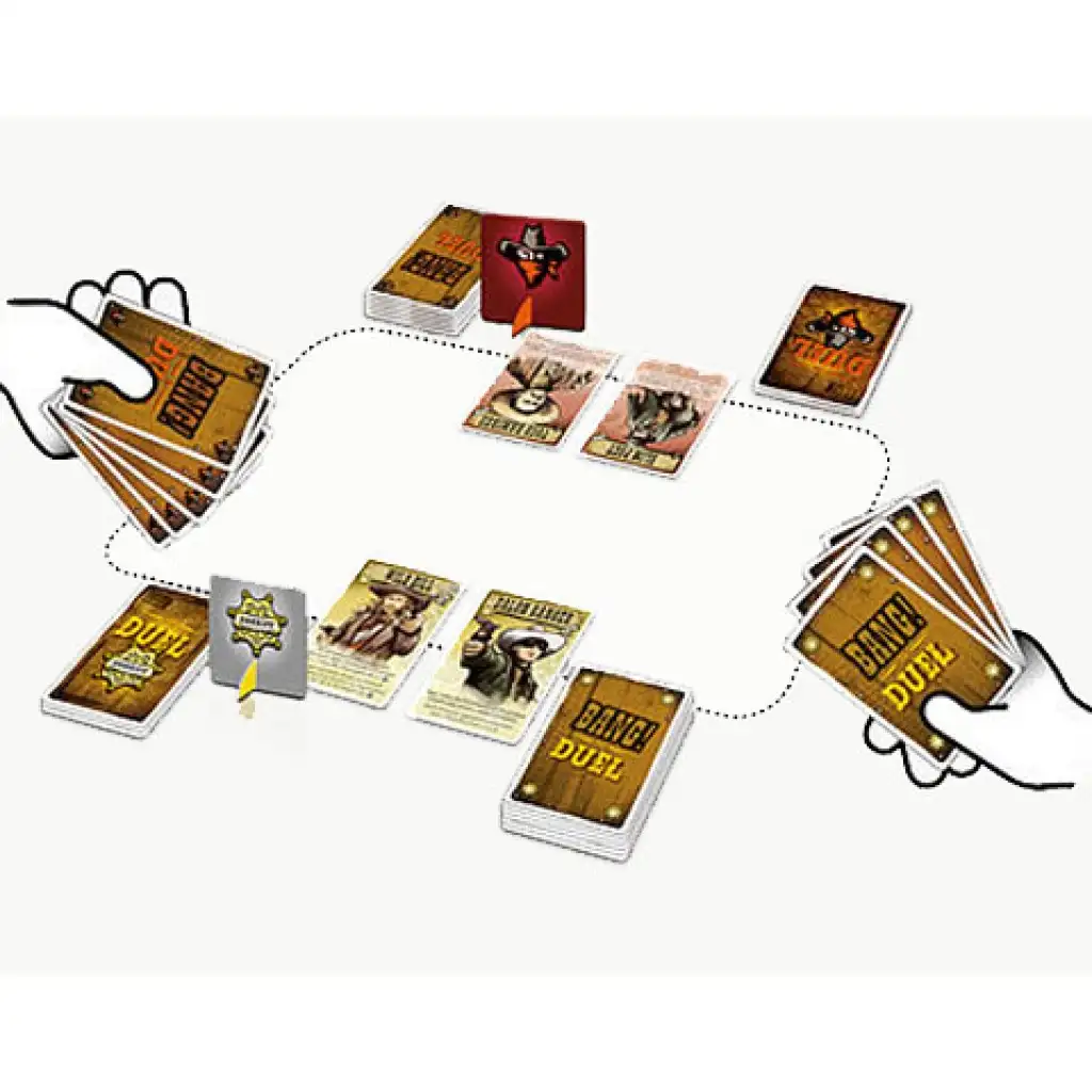 Vrući zrak Divljeg zapada pokreće povjetarac i kotrlja suhe grmove kroz pustu ulicu, gdje se samo dvije odlučne figure gledaju oči u oči. Na prsima jednog od njih blista svjetlost podnevnog sunca na sjajnoj zvijezdi, dok drugi upravo spušta maramu s bradatog lica. Obojica već drže ruke na drškama svojih Colta, a mještani zadržavaju dah promatrajući scenu kroz proreze na kapcima. Dvojica gotovo istovremeno potežu, a oružje opali. BANG! BANG! Dobro poznata i iznimno popularna igra Bang! sada dolazi s verzijom za dva igrača. Naravno, nova igra donosi i nova pravila, ali i u ovoj verziji možemo ponovno vidjeti karte Bačva, Dinamit i Promašaj.