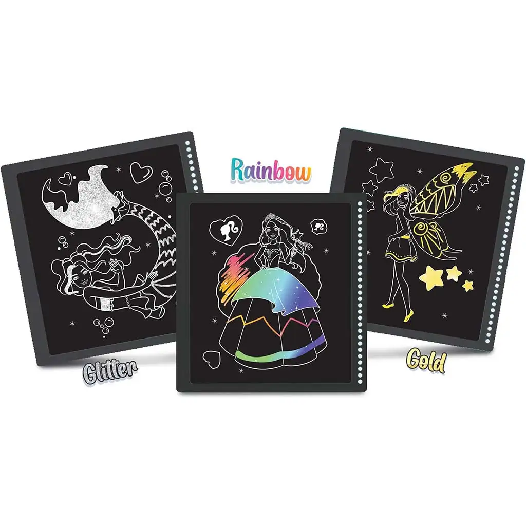 Barbie Mer-Mazing set za izradu strugalica za slike je san svakog djeteta koje voli kreativno stvaranje, sjaj i naravno, Barbie! Spiralno uvezana bilježnica sa 44 stranice puna je iznenađenja s morskom tematikom, gdje sirene, jednorogi, vile i princeze čekaju da ožive pod dječjim prstima. Crne stranice treba strugati posebnim plastičnim alatom za struganje, zahvaljujući kojem se pri svakom potezu pojavljuju čarobne boje – poput zlatne, sjajne ili dugine.