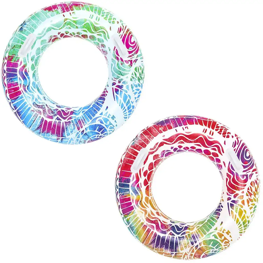 Šareni, vibrantni uzorci nisu samo moderni, već su i izuzetno dobro vidljivi u vodi, čime nude veću sigurnost tijekom upotrebe. Promjer od 91 cm omogućuje udobno plutanje, dok ručke postavljene s obje strane pružaju dodatnu stabilnost. Ove ručke su posebno korisne za djecu i odrasle koji se žele lako popeti na plivački kolut iz vode.