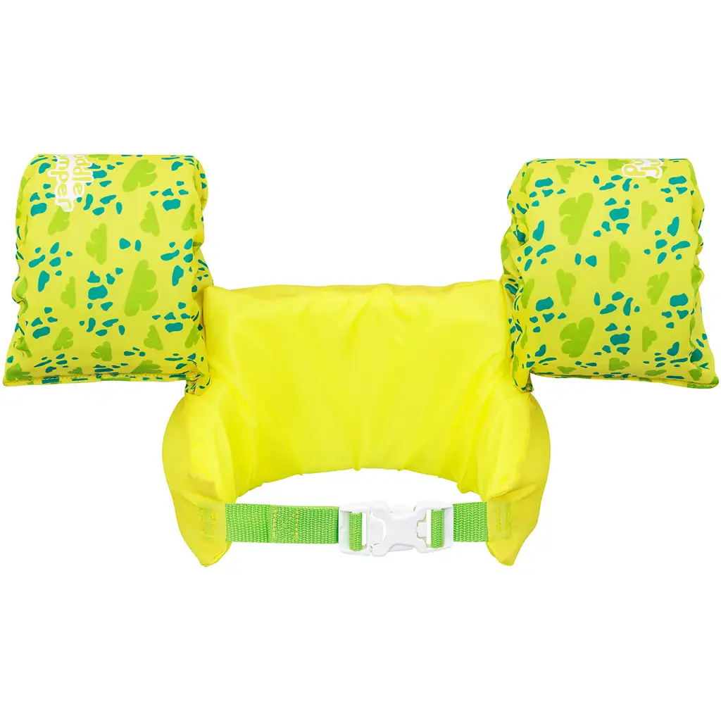 Ovaj prsluk za plivanje spaja prednosti rukavača i remena za prsa, pružajući stabilniji oslonac od klasičnih rukavača. Osim plovaka koji prianjaju uz obje ruke, podstavljeni dio oko tijela osigurava dovoljno uzgona, dok se prsluk jednostavno prilagođava veličini djeteta pomoću podesive kopče na leđima. Ovakav dizajn omogućuje da prsluk ostane na mjestu i tijekom igre, ne kliže se i udobno pristaje.