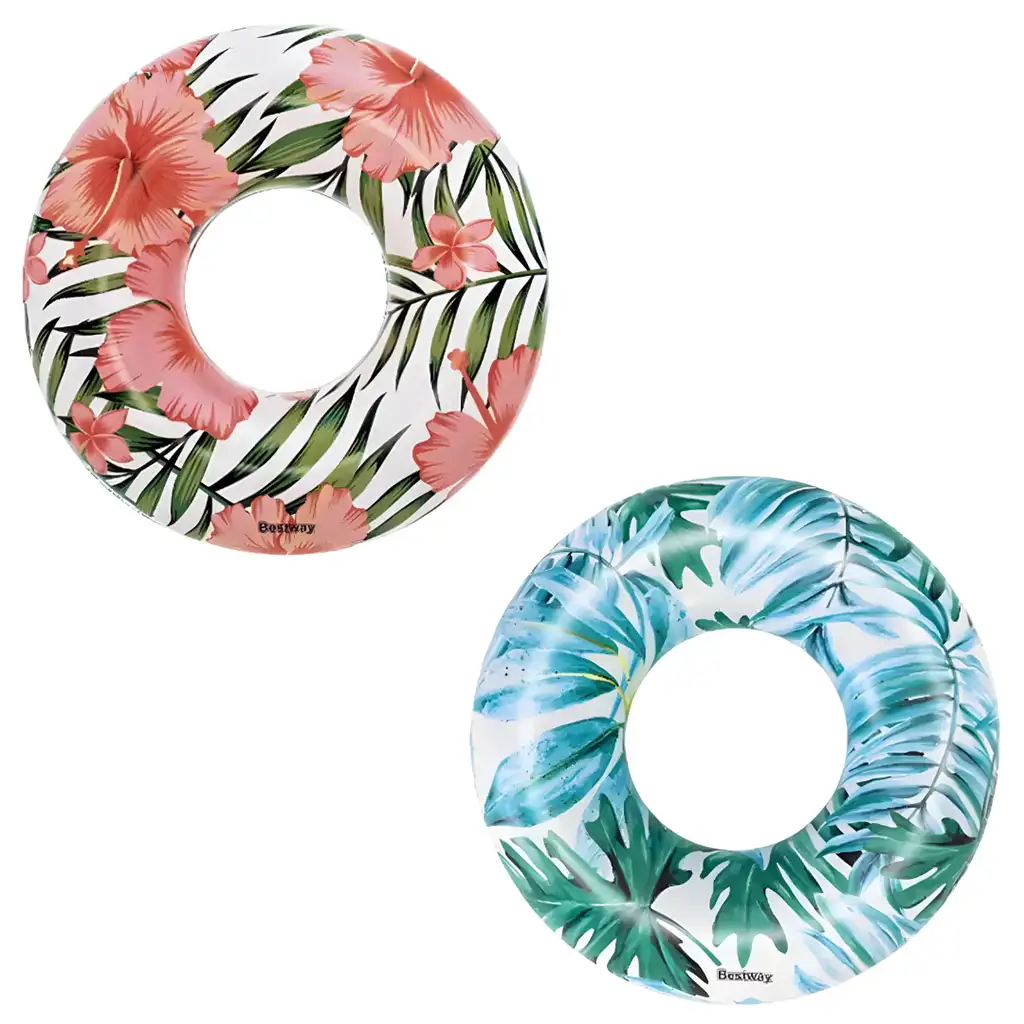 Tropski plivački prsten dostupan je u dvije verzije, veličine 119 cm, idealan je izbor za svakoga tko želi udobno i stilski plivati ili se opustiti u vodi. Dvije verzije, plava i ružičasta, obje imaju impresivan uzorak palmovog lista i tropskog cvijeća, što stvara pravu ljetnu atmosferu.