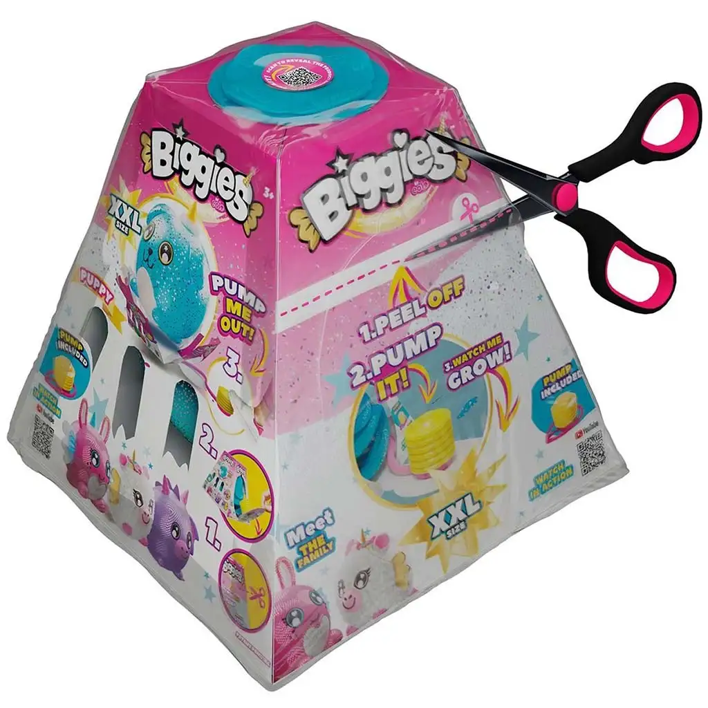 Biggies plišane igračke imaju jedinstven dizajn: velike, sjajne oči i prijateljsko, simpatično lice odmah će očarati djecu. Napuhavanje pomoću pumpe jednostavan je i zabavan zadatak koji čak i mlađa djeca mogu lako obaviti uz nadzor roditelja. Biggies plišane igračke idealne su za djecu od 4 do 10 godina koja vole primati iznenađenja i uživaju u mekim, grljivim igračkama.