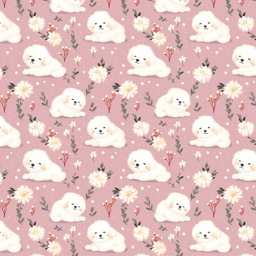 Uzorak: bijeli psići s cvijećem na roza podlozi
