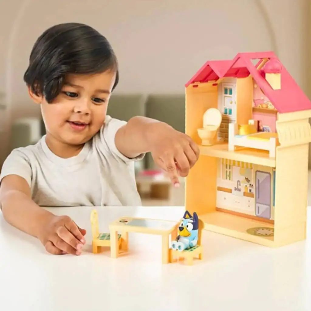 Ova kompaktna igračka kuća ima dvokatni dizajn i sadrži prepoznatljive elemente doma obitelji Heeler. Djeca mogu istraživati udoban dnevni boravak, kuhinju, kupaonicu i spavaću sobu gdje se Bluey može odmoriti nakon dugog dana punog avantura.