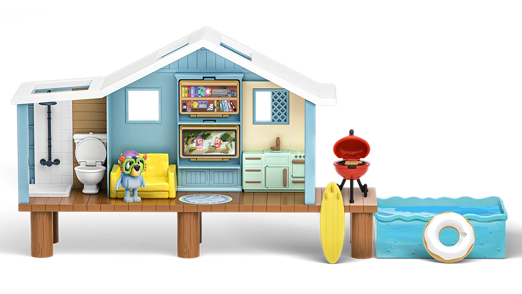 Djeca mogu uživati u opuštanju na plaži u ovom ugodnom, namještenom bungalovu koji uključuje kuhinju, dnevni boravak i kupaonicu. Sklopiva privatna plaža čeka Bluey-a i njegovog prijatelja da surfaju! Dodaci uključuju surf dasku, ljestve, dvorac od pijeska i plutaču, kao i set naljepnica za personalizaciju bungalova!