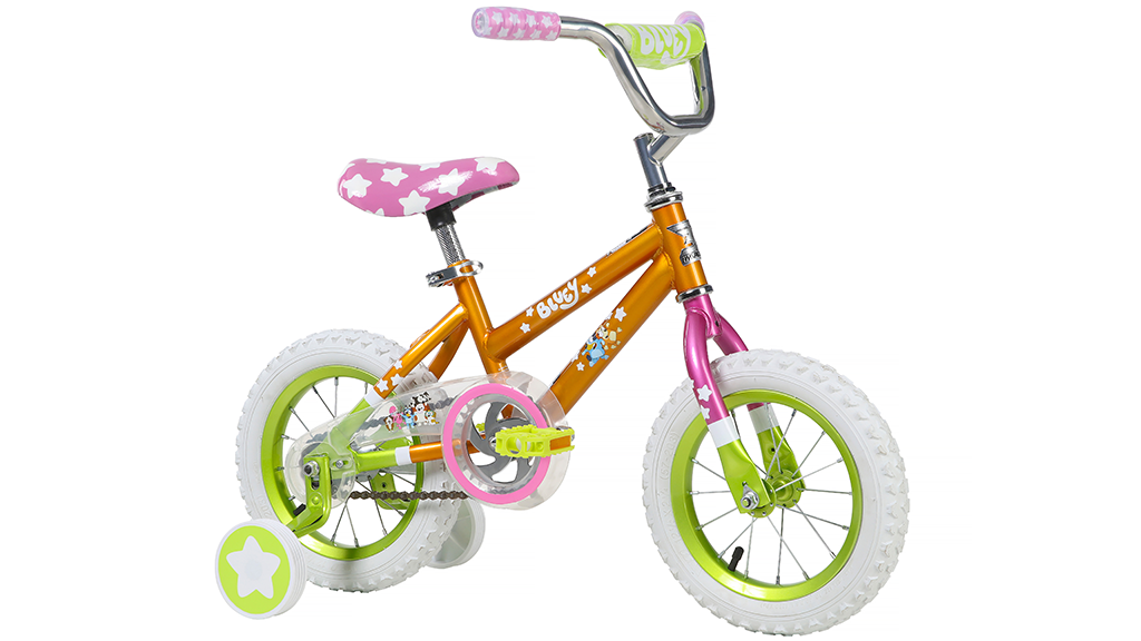 Ovo je 12-inčni bicikl živih plavih, zelenih i narančastih boja, s grafikama inspiriranim Blueyem. Djeca mogu učiti voziti bicikl s odvojivim pomoćnim kotačima i lako upotrebljivim stražnjim kočnicama.