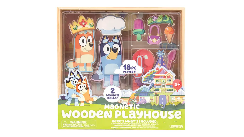 Ovaj set od 18 igračaka uključuje magnetnu drvenu figuru Bluey i Bingo, 12 magnetnih dodataka, re-pozicionirane naljepnice i ploču za višekratnu upotrebu s dva obostrana igrališta.