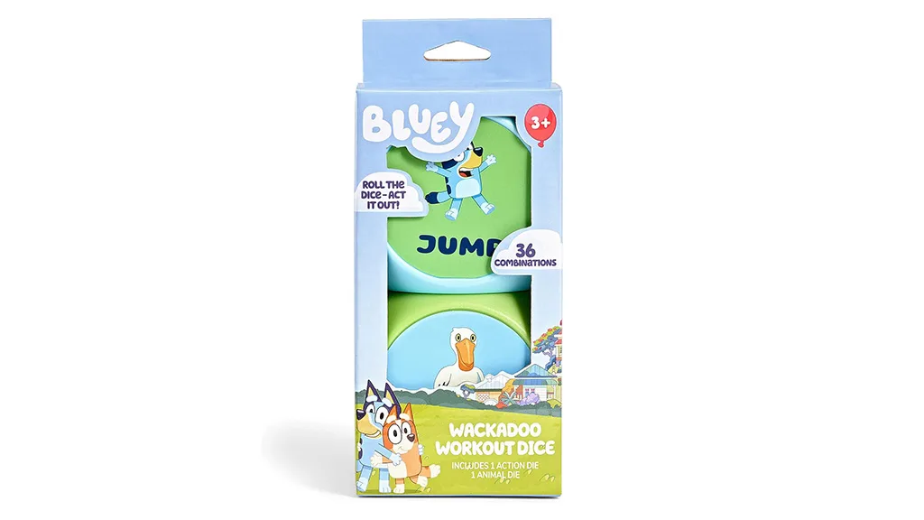 Dodaj malo imaginarnu zabavu u noć igara s ovim setom kockica na temu Bluey. Djeca prvo jednom kockicom biraju životinju, a drugom radnju. Ukupno postoji 36 jedinstvenih kombinacija, kao što su plesati kao pelikan ili skakati kao hobotnica.