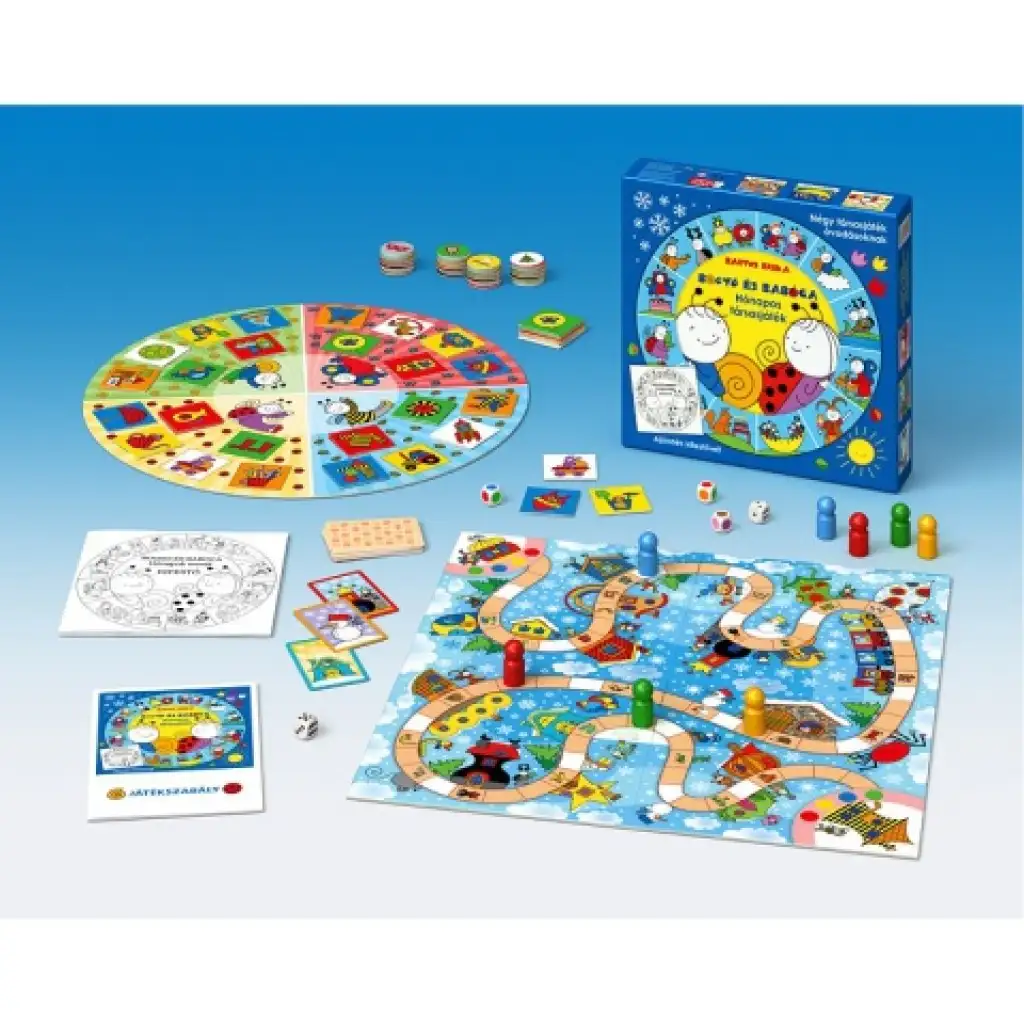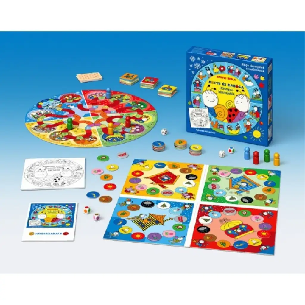 Ova prekrasna društvena igra sadrži četiri igre, koje su sve redom izrađene posebno za predškolsku dob. Igra je ilustrirana simpatičnim likovima i šarenim scenama iz priče Bogyó i Babóca, koju je stvorila Bartos Erika. Jednostavna pravila su lako razumljiva i za najmlađe. U prve dvije igre trebaju prepoznati boje i uskladiti slike. Treća igra vodi kroz godišnja doba, dok u četvrtoj mogu pratiti Pihét do Baltazára kroz zimski šumu. Jednostavnije igre – u skladu s dobnim skupinama – uključuju kocke u boji.