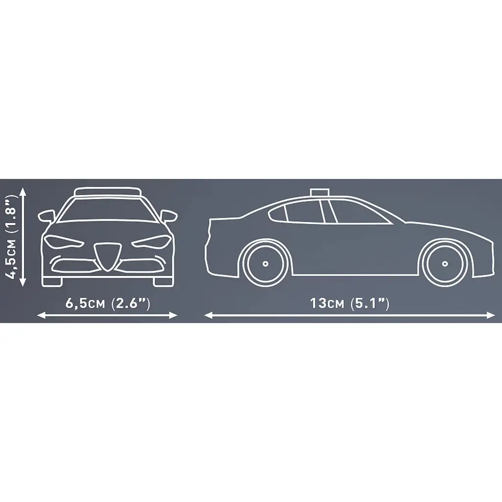 COBI Alfa Romeo Giulia Quadrifoglio policijski automobil građevinska igračka posebna je verzija legendarnog sportskog limuzina, koja se također može pronaći u floti talijanske policije. Model vjerno prenosi stil Alfa Romeo "Quadrifoglio" – kombinira simboliku četverolisne djeteline s elementima službenog dizajna policijskog automobila, čime dobiva jedinstveni karakter uz oblik vjeran originalu.