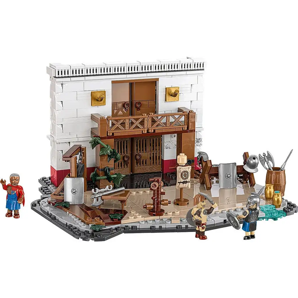 Doživi najuzbudljivije trenutke starog Rima s ovim detaljno izrađenim kompletom za izgradnju Gladijatorske škole, koji sadrži 583 elementa! Lanista, odnosno voditelj škole za gladijatore, već je spreman trenirati robove za krvave borbe na zabavu naroda. U kompletu možeš izgraditi ne samo zgradu škole i dioramu za vježbanje, već ćeš pronaći i tri figure – uključujući dva gladijatora i lanistu.