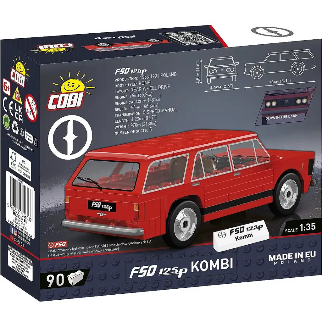 COBI Polski Fiat 125p Kombi građevinski set oživljava legendarno vozilo poljskih cesta, popularni obiteljski karavan. Model u mjerilu 1:35 sastoji se od 90 dijelova, a zahvaljujući detaljnoj izradi savršeno prenosi prepoznatljive linije originalnog automobila. Karavanska karoserija, prostrani zadnji dio i klasični dizajn vjerno su prikazani na modelu. Zahvaljujući gumiranim, rotirajućim kotačima, vozilo se može pomicati, a njegova čvrsta konstrukcija ga čini odličnim i kao izložbeni model. Otisnuti ukrasi su postojani i otporni na trošenje, tako da nema potrebe za naljepnicama.