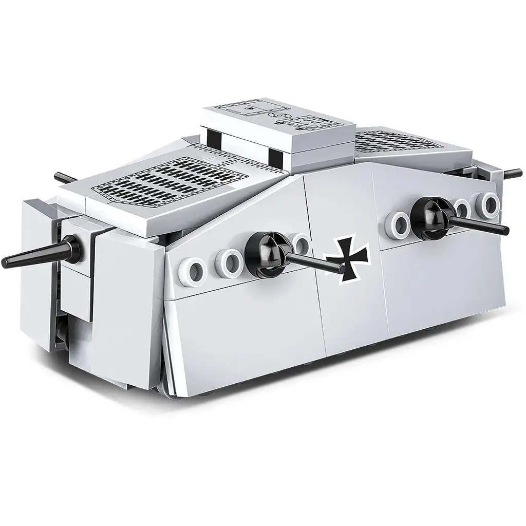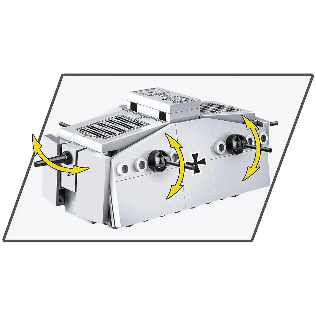 COBI Sturmpanzerwagen A7V set za sastavljanje prikazuje jedan od najposebnijih oklopnih vozila iz Prvog svjetskog rata. A7V bio je jedini njemački tenk koji se proizvodio u seriji tijekom tog razdoblja, a proizvedeno je samo dvadeset primjeraka. S velikim dimenzijama i prepoznatljivim oklopnim tijelom, postao je jedno od najpoznatijih borbenih vozila tog doba. Model je napravljen u razmjeru 1:72, sastoji se od 119 visokokvalitetnih dijelova, a dimenzije gotovog vozila su 11,5 cm duljine, 7,5 cm širine i 4,5 cm visine.