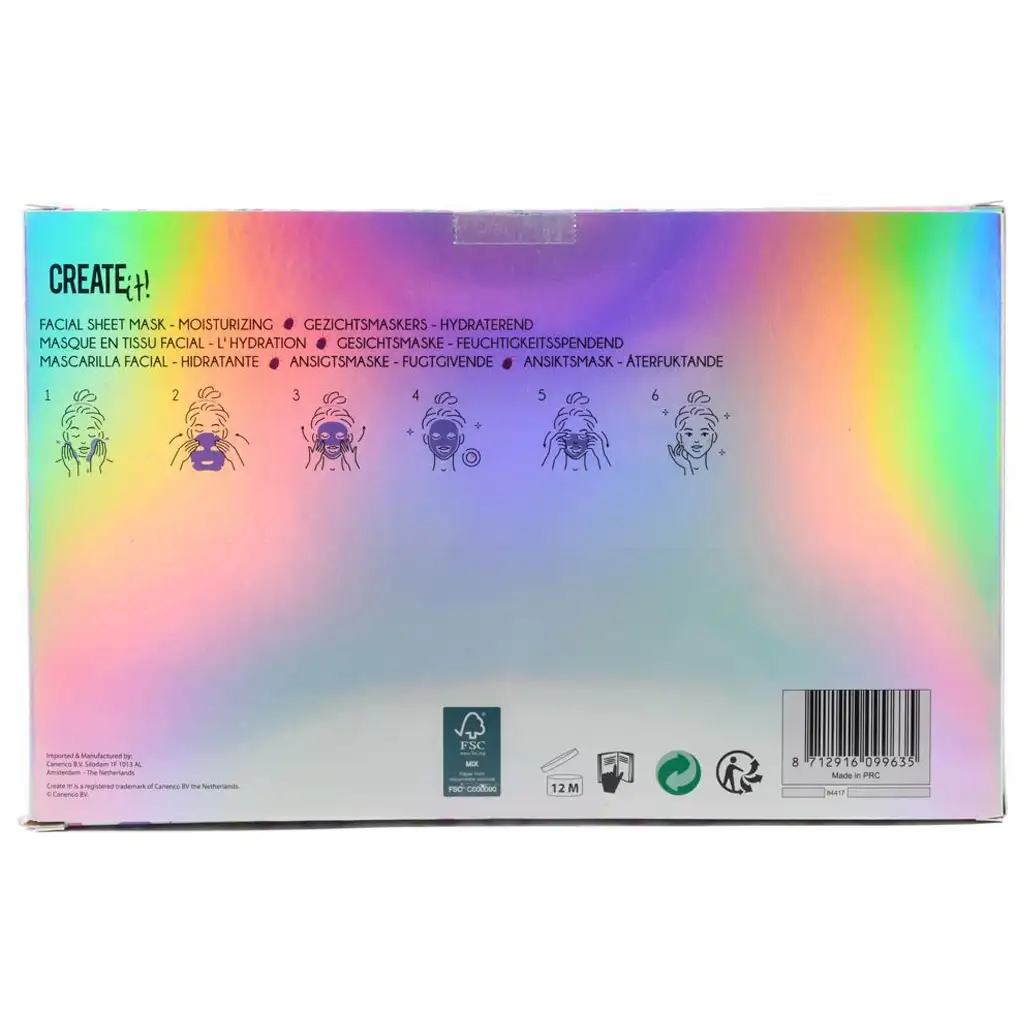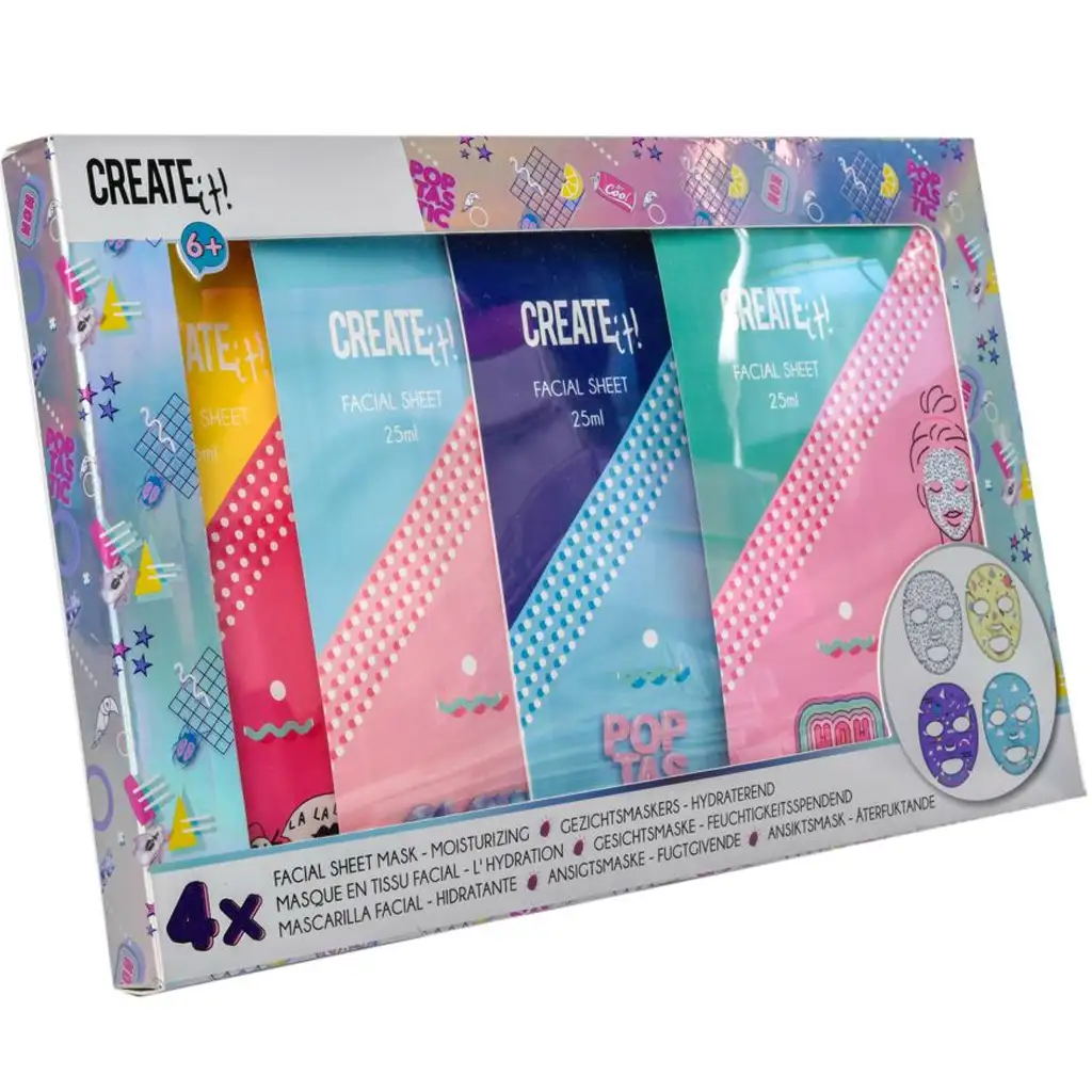 Set hidratantnih maski za lice Create It! pruža pravo wellness iskustvo već od 6 godina, u razigranom, šarenom i stiliziranom obliku! Ovaj poseban paket za njegu ljepote sadrži četiri maske od tekstila u obliku lica, koje ne samo da čine kožu mekom i hidratiziranom, već pružaju i sjajnu zabavu malim ljubiteljima ljepote.