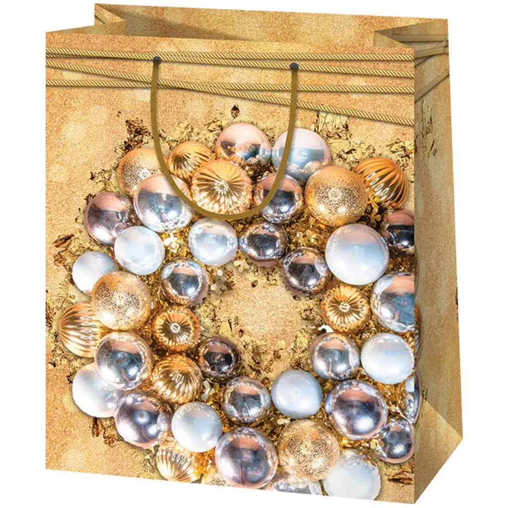 Ova Cardex zlatna poklon vrećica utjelovljuje božićnu eleganciju. Dizajn vrećice krasi vijenac sastavljen od sjajnih zlatnih, srebrnih i bisernih božićnih kuglica, koji odiše pravim luksuzom. Prostrana veličina od 26x13x33 cm idealna je za veće poklone, poput odjeće, knjiga ili čak manjih ukrasnih predmeta. Zlatna pozadina i fini detalji daju vrećici svečani sjaj, čineći je već samom po sebi upečatljivim dodatkom vašem poklonu. Izdržljiv papirni materijal i zlatne ručke pružaju snažan i pouzdan držač kako bi vaš poklon sigurno stigao na odredište. Savršen izbor za one koji traže zaista stilsko pakiranje za blagdane.
