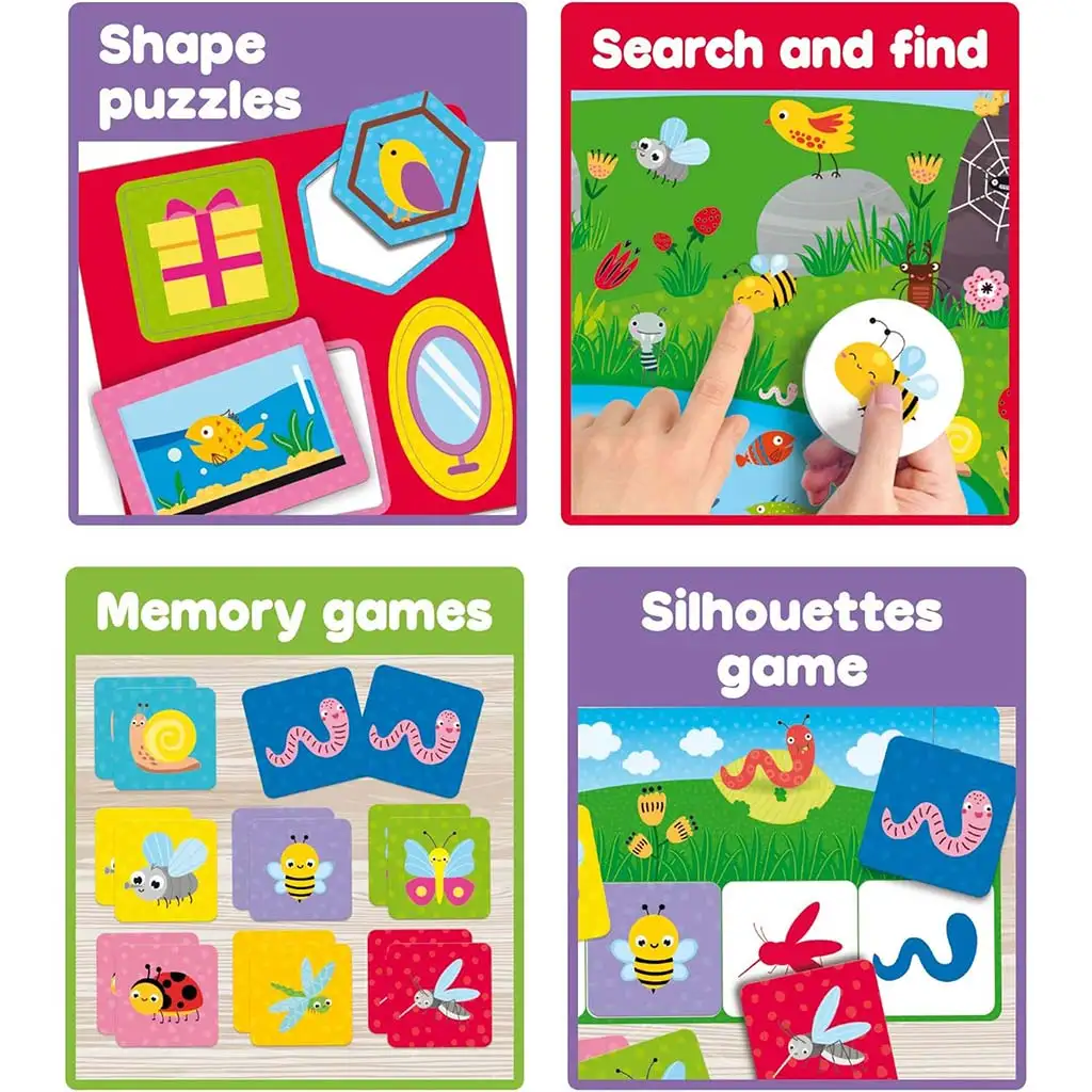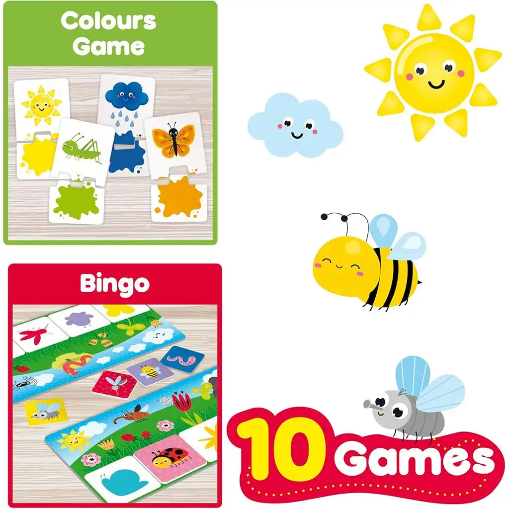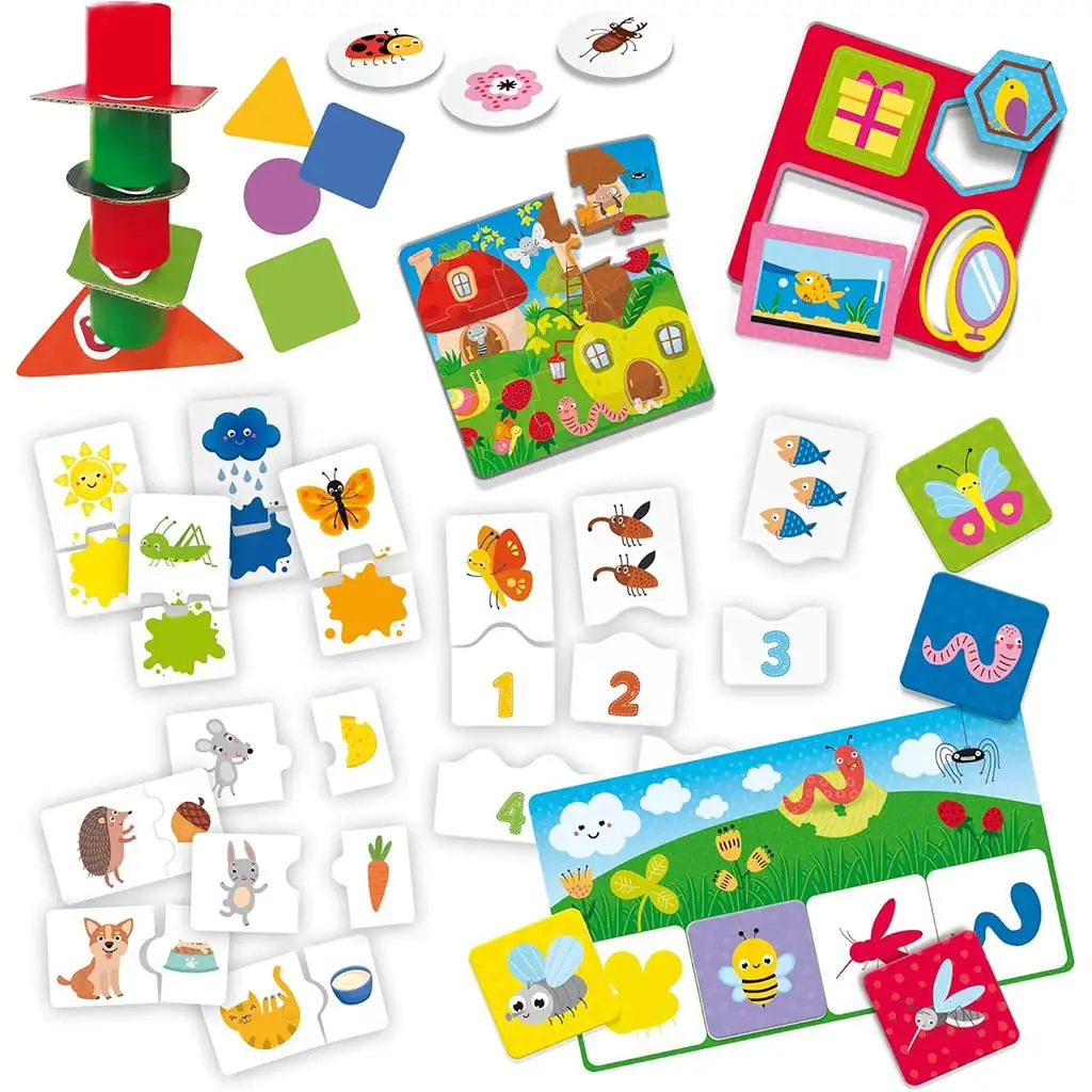 Ova šarena i vesela kolekcija igračaka savršen je izbor za djecu stariju od 2 godine koja žele kroz igru istraživati svijet oko sebe. Paket sadrži 10 različitih edukativnih igara koje pomažu mališanima u razvoju intelektualnih sposobnosti, motorike, logičkog razmišljanja i rječnika. U kutiji ćete pronaći toranj za slaganje oblika, slagalice, igre sjena i memorije, zadatke za traženje, usklađivanje boja, igre s prvim brojevima i još mnogo toga. Svaka igra donosi novo iskustvo i razvija različite vještine – bilo da se radi o prepoznavanju oblika, brojeva, životinja ili boja.