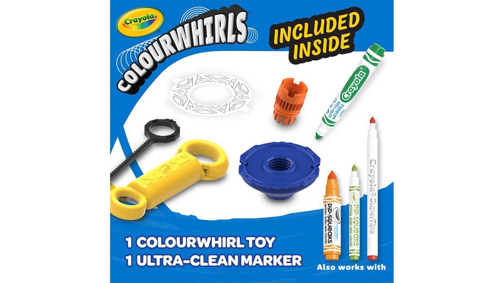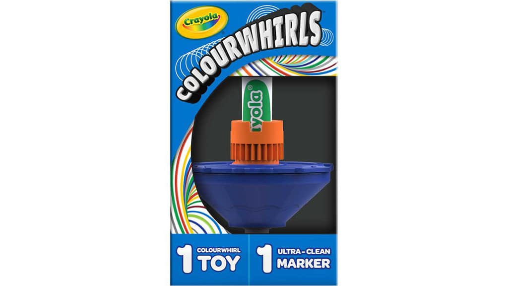 Djeca mogu izrađivati šarene spiralne umjetničke radove uz pomoć Crayola Colourwhirls. Ovaj "set za izradu" kombinira klasičnu igru s vrtiljkom s perivim flomasterima marke, nudeći novi način igre i stvaranja. Nakon što se flomaster postavi u vrtiljak, djeca mogu okretati vrtiljke pomoću ručke i povlačne vrpce te stvarati spiralne umjetničke radove. Colourwhirls je dostupan pojedinačno i u setu od tri komada, a kompatibilan je s drugim Crayola proizvodima, uključujući debele i tanke flomastere, pip-squeaks i super tips.