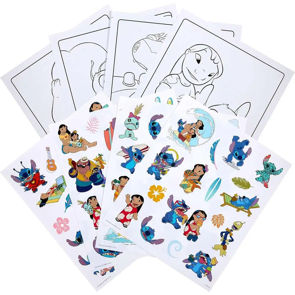 Na četiri stranice šarenih naljepnica nalaze se popularne scene i likovi poput Stitcha na dasci za surfanje, Lilo zagrljaja ili nestašnih vanzemaljaca u akciji. Naljepnice se lako skidaju i mogu se ponovno zalijepiti, pa djeca tijekom igre mogu stalno stvarati nove i nove scene. Jednostavne konture stranica za bojanje savršene su već za djecu od 3 godine, čak i za samostalno stvaranje.