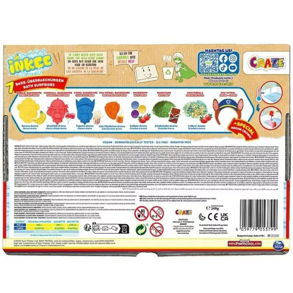 Može početi spašavanje kupanja s Psićima u ophodnji! Craze Inkee Psići u ophodnji veliki set za kupanje je uzbudljiv, 7-dijelni paket iznenađenja za kupanje koji će zasigurno uljepšati kupanje u kadi za svako dijete. Glavni junaci paketa su Chase, Marshall i Rubble, koji u obliku mirisnih bombi za kupanje pomažu djeci da večernje kupanje učine zabavnim i mirisnim.