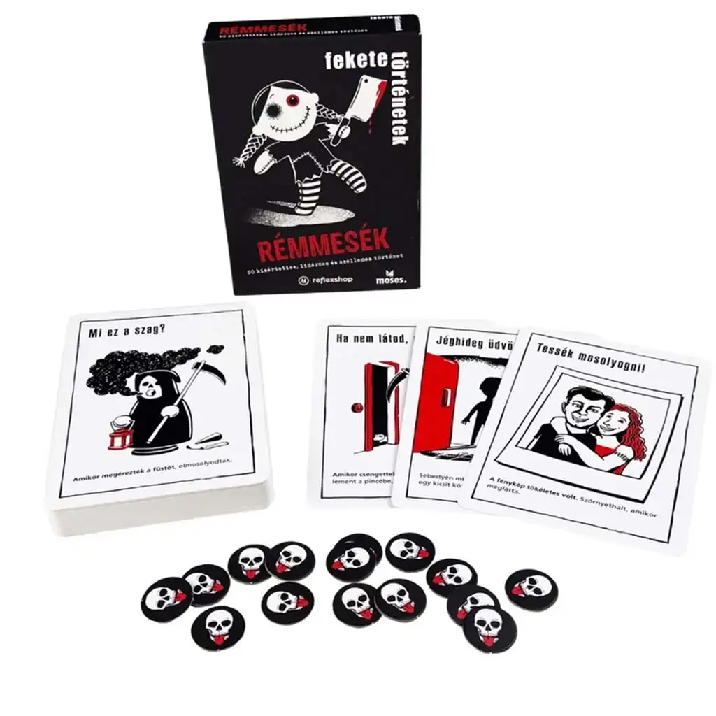 Pripremi se za igru od koje će ti jeza prouzrokovati trnce niz leđa – ali ipak ćeš uz smijeh rješavati najmračnije misterije! Crne priče: Strašne bajke izuzetno su posebna društvena igra koja donosi 50 bizarnih, jezivih, a ipak zabavnih priča, nastalih kombinacijom stvarnih slučajeva smrti i morbidnog humora. Ne završava svaka misterija sretnim krajem... ali to igru čini još uzbudljivijom!