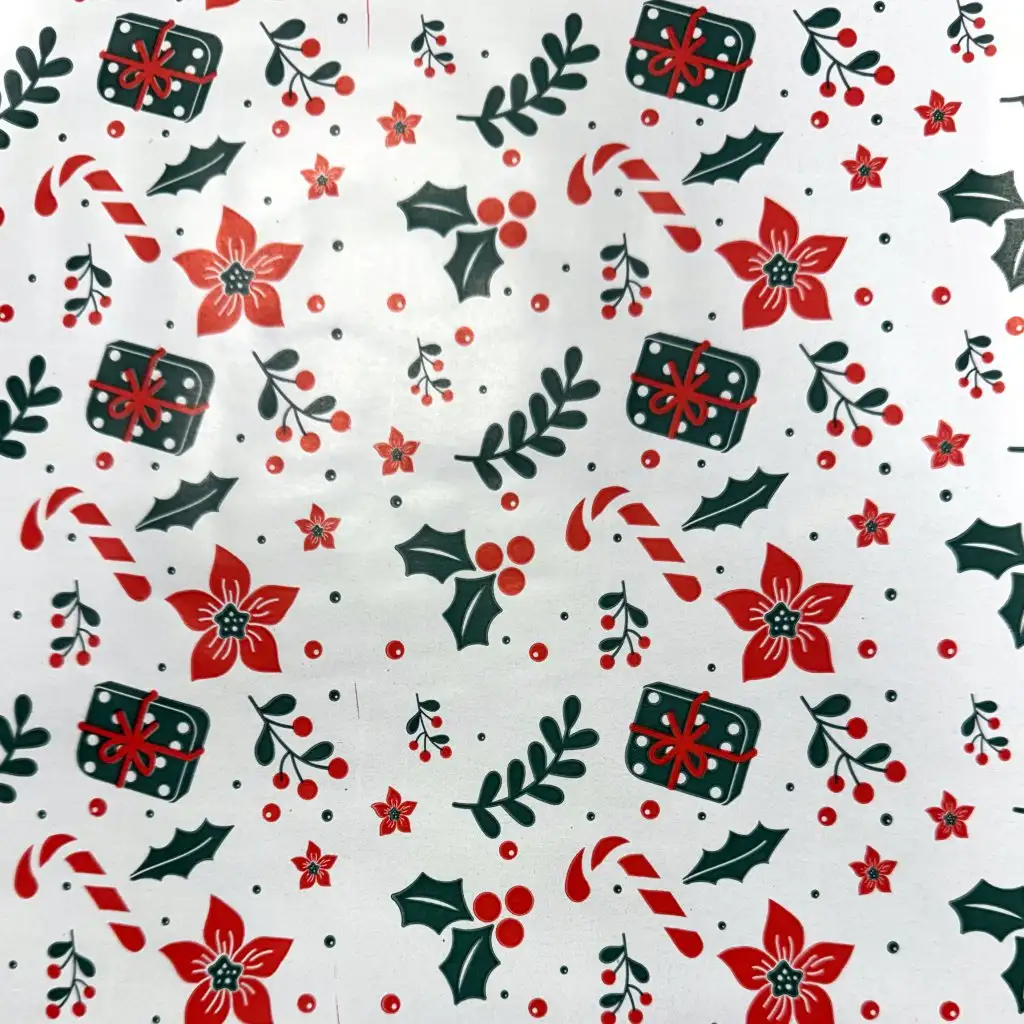 Ako želite zaista ugodno i razigrano pakiranje za Božić, omotni papir „Holiday Joy” je izvrstan izbor. Crvene i zelene božićne motive – štapići od slatkiša, poklon-kutije s mašnama, listovi imele, bobice, mali cvjetovi i borove grančice – na bijeloj podlozi, daju svakom daru prijateljski i radosni izgled. Ovaj uzorak je istovremeno klasičan i moderan, savršen za one koji žele istaknuti veselu, šarenu stranu Božića.