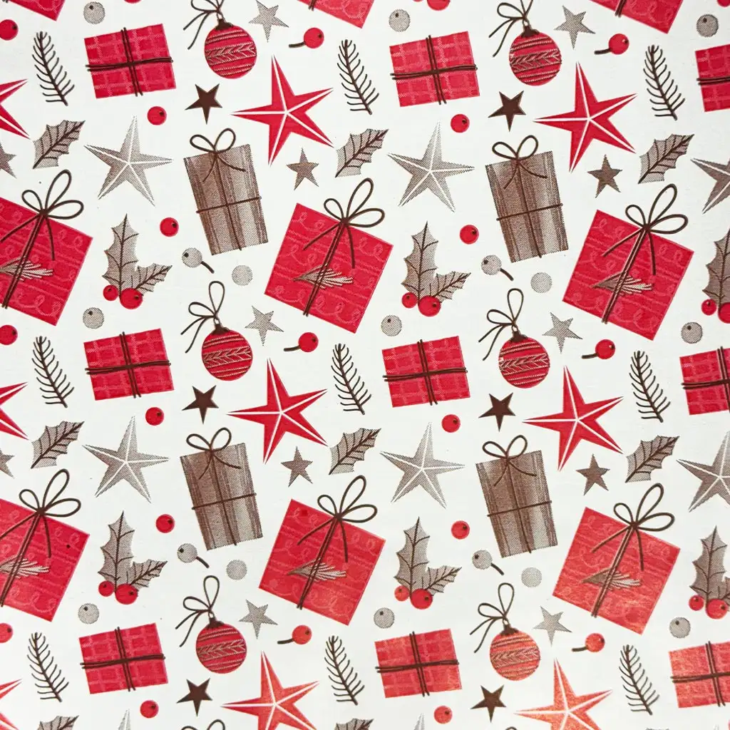 Učinite božićne poklone zaista svečanim s ovim upečatljivim i elegantnim „Red Festive Joy” ukrasnim papirom! Svaki kvadratni centimetar papira priziva klasično božićno raspoloženje: crvene i smeđe poklon-kutije, zvjezdice, bobice, grane bora i blagdanski ukrasi ponavljaju se na bijeloj podlozi, stvarajući savršenu blagdansku harmoniju. Raznoliti uzorci su razigrani, a ipak skladni, pa već na prvi pogled zamotani poklon pruža posebno iskustvo.