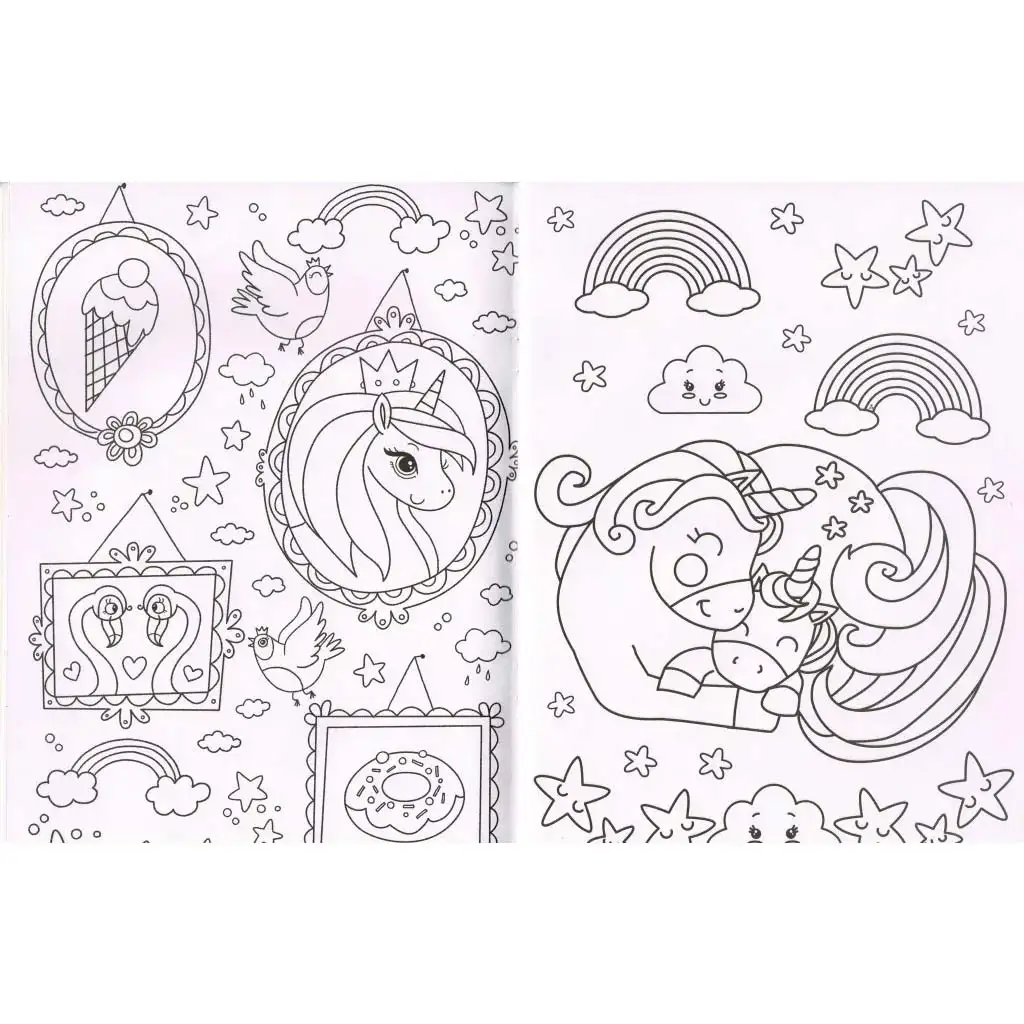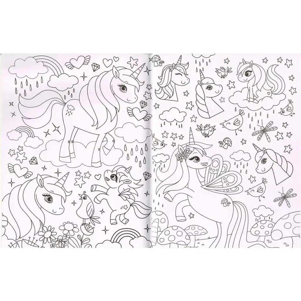 Na svakoj stranici bojanke, svaki jednorog skriva posebnu priču – neki se igraju sa svojim prijateljima među oblacima, dok drugi spokojno odmaraju ispod duge. Djeca mogu slobodno birati koje će boje koristiti, a zatim dodati dodatni sjaj svojim djelima uz priložene dijamantne naljepnice. Ružičasta svjetlucava griva? Ili čarobni krajolik gdje svako drvo svjetluca duginim bojama? U ovoj knjizi sve je moguće!