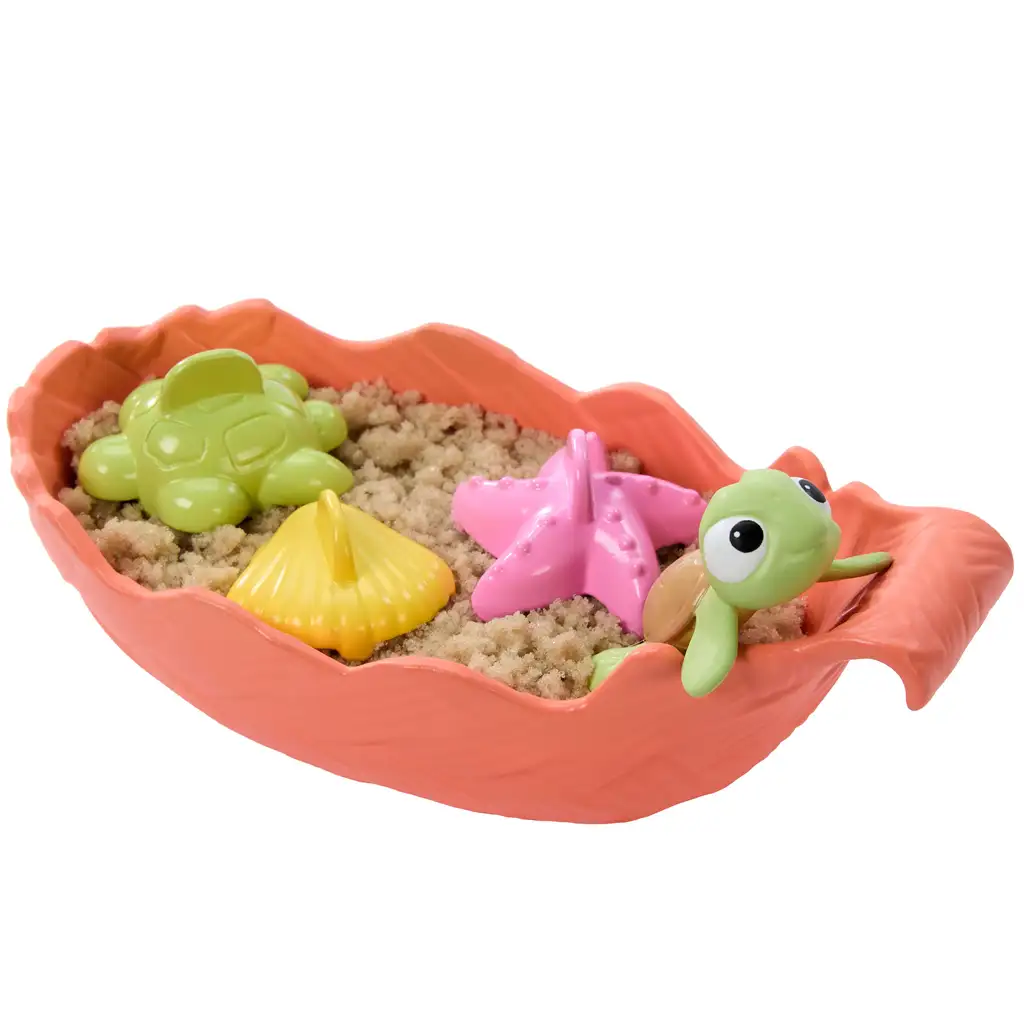 Set sadrži oblikovanu masu za pijesak, koja je savršena podloga za kreativnu igru. Uz priložene kalupe za pijesak – zvijezda, školjka, kornjača i cvijet – djeca mogu izrađivati razne oblike, a zatim ih postavljati pomoću lopatice u obliku lista ili posude u obliku čamca. Mali lik kornjače dodatno obogaćuje doživljaj igre, jer Vaianine avanture sada može pratiti i njezin simpatičan životinjski prijatelj.