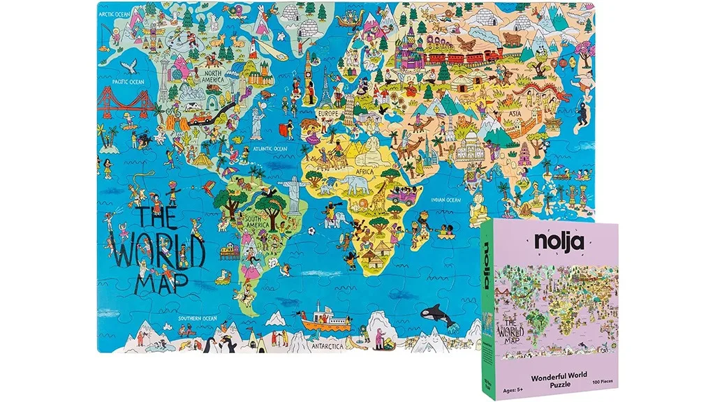 planeta.Ova slagalica od 100 dijelova prikazuje šarenu ilustraciju svjetske karte na kojoj su vidljive grafike ljudi, prirode i životinja. Djeca mogu upoznati različite zemlje uz pomoć priloženog informativnog lista koji ističe raznolikost, tradicije i skrivene dragulje jedne nacije.