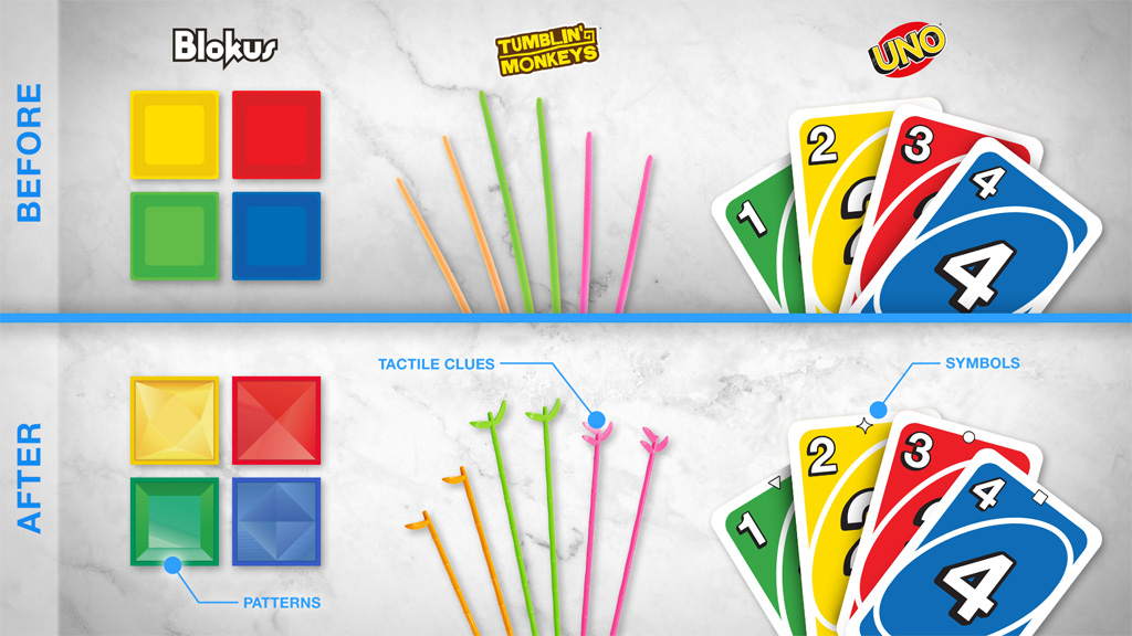 "Tematske" kartaške igre postaju sve "pristupačnije"!Djeca i obitelji koji žive s daltonizmom mogu proširiti svoju kolekciju igračaka jer je Mattel posvećen tome da većinu svojih igara učini prilagođenima za daltoniste, uključujući UNO i brojne varijante UNO-a, Tumblin’ Monkeys, Blokus, Skip-Bo i Phase 10. Kako bi igre bile još inkluzivnije, Mattel je surađivao sa stručnjacima za poremećaje vida i igračima s daltonizmom.